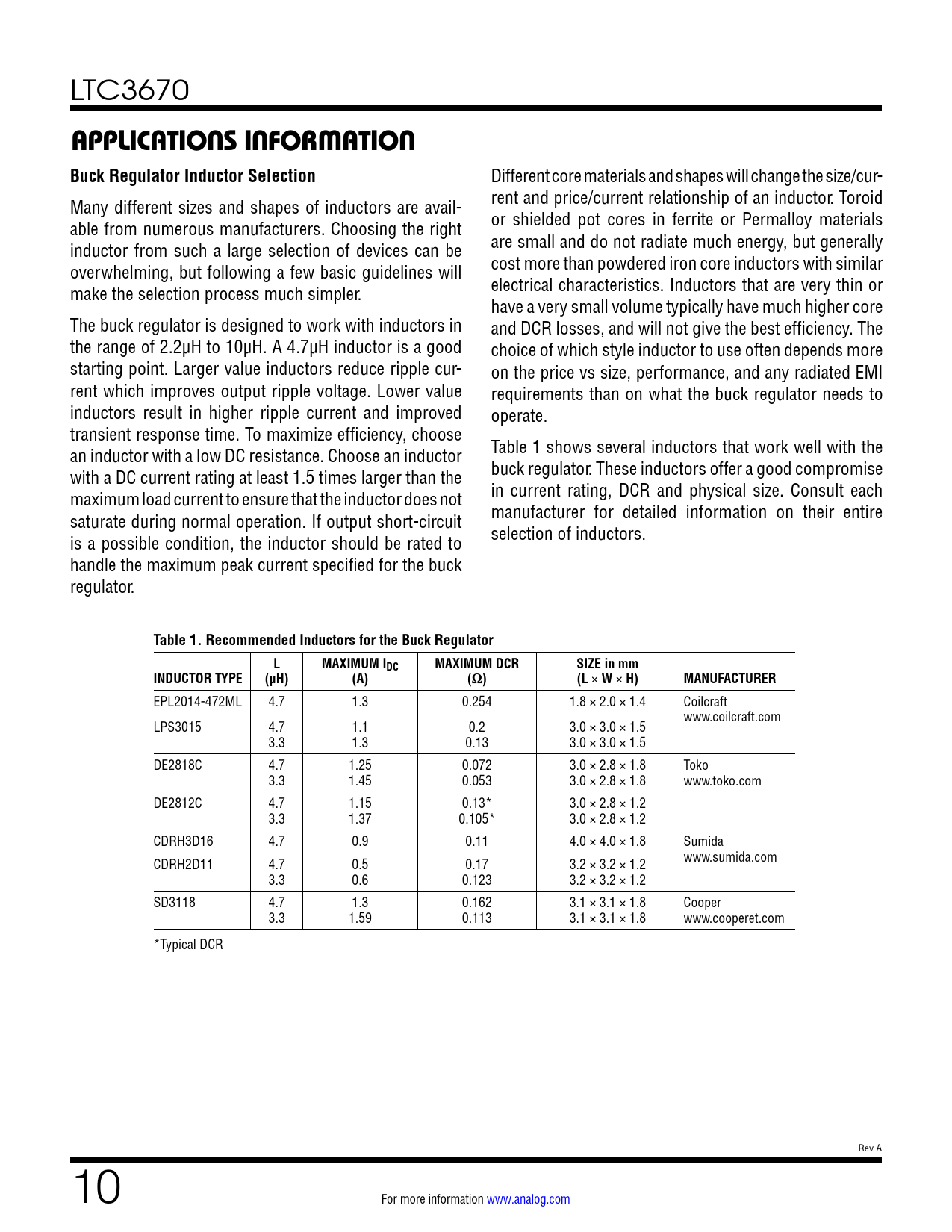 APPLICATIONS INFORMATION. Buck Regulator Inductor Selection. Table 1. Recommended Inductors for the Buck Regulator