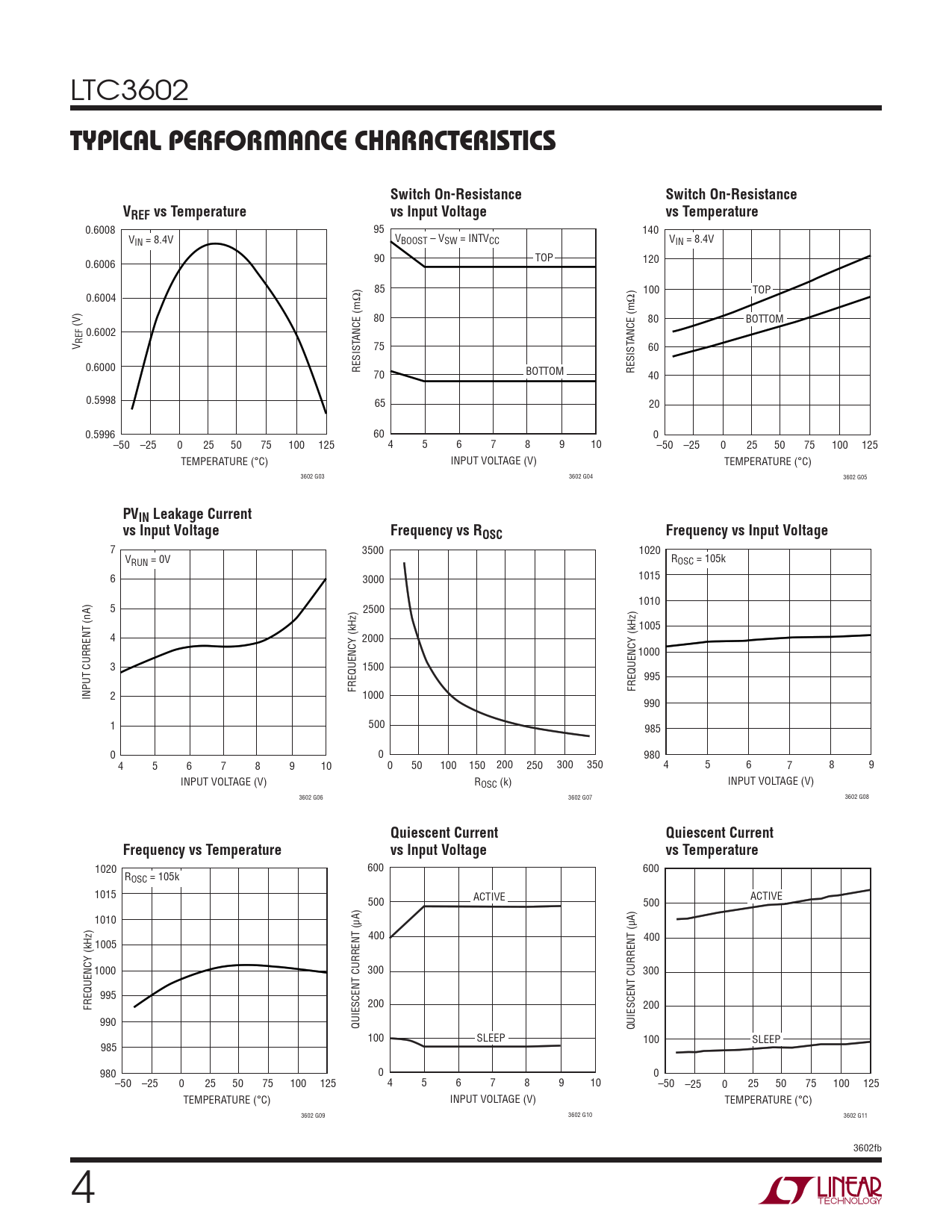 0.6008 95 140 VIN = 8.4V VBOOST – VSW = INTVCC VIN = 8.4V 90 TOP 120 0.6006 85 100 TOP 0.6004 80 80 BOTTOM (V) 0.6002 REF ANCE (mΩ) ANCE (mΩ) V 75 60 0.6000 RESIST 70 BOTTOM RESIST 40 0.5998 65 20 0.5996 60 0 –50 –25 0 25 50 75 100 125 4 5 6 7 8 9 10 –50 –25 0 25 50 75 100 125 TEMPERATURE (°C) INPUT VOLTAGE (V) TEMPERATURE (°C) 3602 G03 3602 G04 3602 G05