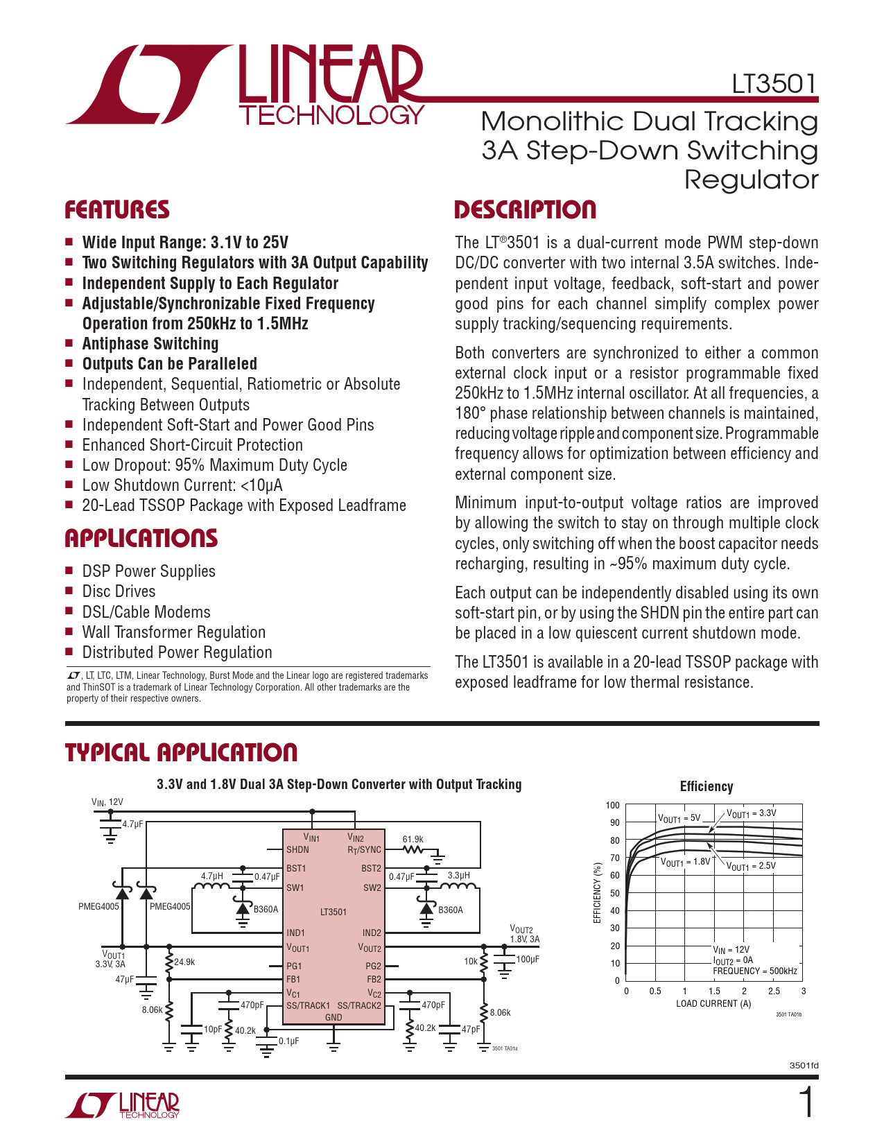 LT3501 Monolithic Dual Tracking 3A Step-Down Switching Regulator FeaTuresDescripTion n Wide Input Range: 3.1V to 25V The LT®3501 is a dual-current mode PWM step-down n Two Switching Regulators with 3A Output Capability DC/DC converter with two internal 3.5A switches. Inde- n Independent Supply to Each Regulator pendent input voltage, feedback, soft-start and power n Adjustable/Synchronizable Fixed Frequency good pins for each channel simplify complex power Operation from 250kHz to 1.5MHz supply tracking/sequencing requirements. n Antiphase Switching Both converters are synchronized to either a common n Outputs Can be Paralleled external clock input or a resistor programmable fixed n Independent, Sequential, Ratiometric or Absolute 250kHz to 1.5MHz internal oscillator. At all frequencies, a Tracking Between Outputs 180° phase relationship between channels is maintained, n Independent Soft-Start and Power Good Pins reducing voltage ripple and component size. Programmable n Enhanced Short-Circuit Protection frequency allows for optimization between efficiency and n Low Dropout: 95% Maximum Duty Cycle external component size. n Low Shutdown Current: <10µA n 20-Lead TSSOP Package with Exposed Leadframe Minimum input-to-output voltage ratios are improved by allowing the switch to stay on through multiple clock applicaTions cycles, only switching off when the boost capacitor needs n recharging, resulting in ~95% maximum duty cycle. DSP Power Supplies n Disc Drives Each output can be independently disabled using its own n DSL/Cable Modems soft-start pin, or by using the SHDN pin the entire part can n Wall Transformer Regulation be placed in a low quiescent current shutdown mode. n Distributed Power Regulation The LT3501 is available in a 20-lead TSSOP package with L, LT, LTC, LTM, Linear Technology, Burst Mode and the Linear logo are registered trademarks and ThinSOT is a trademark of Linear Technology Corporation. All other trademarks are the exposed leadframe for low thermal resistance. property of their respective owners. Typical applicaTion3.3V and 1.8V Dual 3A Step-Down Converter with Output TrackingEfficiency VIN, 12V 100 V 4.7µF 90 OUT1 = 5V VOUT1 = 3.3V VIN1 VIN2 61.9k 80 SHDN RT/SYNC 70 V BST1 BST2 OUT1 = 1.8V VOUT1 = 2.5V 4.7µH 0.47µF 0.47µF 3.3µH 60 SW1 SW2 50 PMEG4005 PMEG4005 B360A LT3501 B360A 40 EFFICIENCY (%) VOUT2 IND1 IND2 30 1.8V, 3A V V 20 V OUT1 OUT2 V OUT1 IN = 12V 3.3V, 3A 24.9k 10k 100µF I PG1 PG2 10 OUT2 = 0A FREQUENCY = 500kHz 47µF FB1 FB2 0 VC1 VC2 0 0.5 1 1.5 2 2.5 3 LOAD CURRENT (A) 8.06k 470pF SS/TRACK1 SS/TRACK2 470pF GND 8.06k 3501 TA01b 10pF 40.2k 40.2k 47pF 0.1µF 3501 TA01a 3501fd 1 Document Outline Features Applications Description Typical Application Absolute Maximum Ratings Pin Configuration Order Information Electrical Characteristics Typical Performance Characteristics Pin Functions Block Diagram Applications Information Typical Applications Package Description Revision History Related Parts
