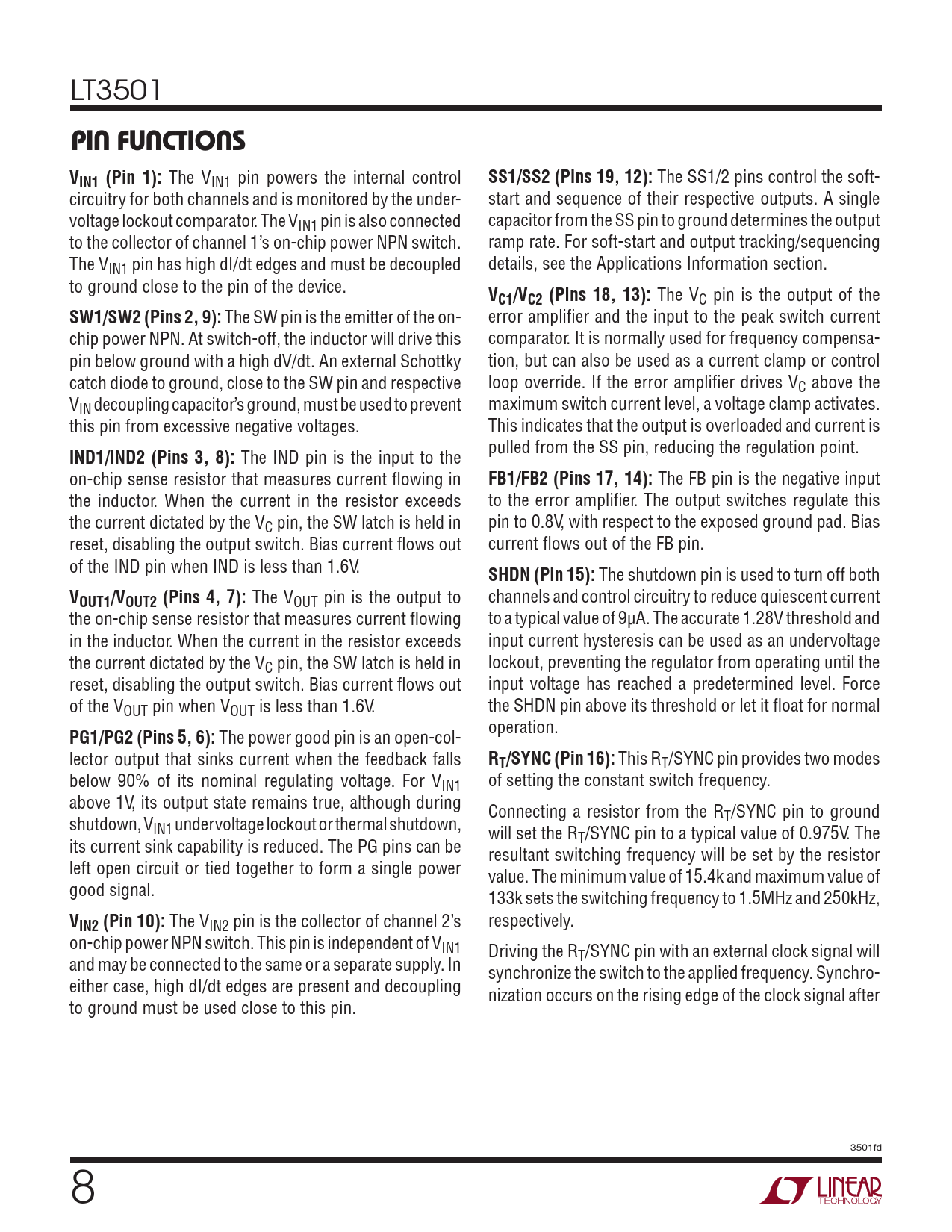 LT3501 pin FuncTionsVIN1 (Pin 1): The VIN1 pin powers the internal control SS1/SS2 (Pins 19, 12): The SS1/2 pins control the soft- circuitry for both channels and is monitored by the under- start and sequence of their respective outputs. A single voltage lockout comparator. The VIN1 pin is also connected capacitor from the SS pin to ground determines the output to the collector of channel 1’s on-chip power NPN switch. ramp rate. For soft-start and output tracking/sequencing The VIN1 pin has high dI/dt edges and must be decoupled details, see the Applications Information section. to ground close to the pin of the device. VC1/VC2 (Pins 18, 13): The VC pin is the output of the SW1/SW2 (Pins 2, 9): The SW pin is the emitter of the on- error amplifier and the input to the peak switch current chip power NPN. At switch-off, the inductor will drive this comparator. It is normally used for frequency compensa- pin below ground with a high dV/dt. An external Schottky tion, but can also be used as a current clamp or control catch diode to ground, close to the SW pin and respective loop override. If the error amplifier drives VC above the VIN decoupling capacitor’s ground, must be used to prevent maximum switch current level, a voltage clamp activates. this pin from excessive negative voltages. This indicates that the output is overloaded and current is IND1/IND2 (Pins 3, 8): The IND pin is the input to the pulled from the SS pin, reducing the regulation point. on-chip sense resistor that measures current flowing in FB1/FB2 (Pins 17, 14): The FB pin is the negative input the inductor. When the current in the resistor exceeds to the error amplifier. The output switches regulate this the current dictated by the VC pin, the SW latch is held in pin to 0.8V, with respect to the exposed ground pad. Bias reset, disabling the output switch. Bias current flows out current flows out of the FB pin. of the IND pin when IND is less than 1.6V. SHDN (Pin 15): The shutdown pin is used to turn off both VOUT1/VOUT2 (Pins 4, 7): The VOUT pin is the output to channels and control circuitry to reduce quiescent current the on-chip sense resistor that measures current flowing to a typical value of 9µA. The accurate 1.28V threshold and in the inductor. When the current in the resistor exceeds input current hysteresis can be used as an undervoltage the current dictated by the VC pin, the SW latch is held in lockout, preventing the regulator from operating until the reset, disabling the output switch. Bias current flows out input voltage has reached a predetermined level. Force of the VOUT pin when VOUT is less than 1.6V. the SHDN pin above its threshold or let it float for normal PG1/PG2 (Pins 5, 6): The power good pin is an open-col- operation. lector output that sinks current when the feedback falls RT/SYNC (Pin 16): This RT/SYNC pin provides two modes below 90% of its nominal regulating voltage. For VIN1 of setting the constant switch frequency. above 1V, its output state remains true, although during Connecting a resistor from the R shutdown, V T/SYNC pin to ground IN1 undervoltage lockout or thermal shutdown, will set the R its current sink capability is reduced. The PG pins can be T/SYNC pin to a typical value of 0.975V. The resultant switching frequency will be set by the resistor left open circuit or tied together to form a single power value. The minimum value of 15.4k and maximum value of good signal. 133k sets the switching frequency to 1.5MHz and 250kHz, VIN2 (Pin 10): The VIN2 pin is the collector of channel 2’s respectively. on-chip power NPN switch. This pin is independent of VIN1 Driving the R and may be connected to the same or a separate supply. In T/SYNC pin with an external clock signal will synchronize the switch to the applied frequency. Synchro- either case, high dI/dt edges are present and decoupling nization occurs on the rising edge of the clock signal after to ground must be used close to this pin. 3501fd 8 Document Outline Features Applications Description Typical Application Absolute Maximum Ratings Pin Configuration Order Information Electrical Characteristics Typical Performance Characteristics Pin Functions Block Diagram Applications Information Typical Applications Package Description Revision History Related Parts