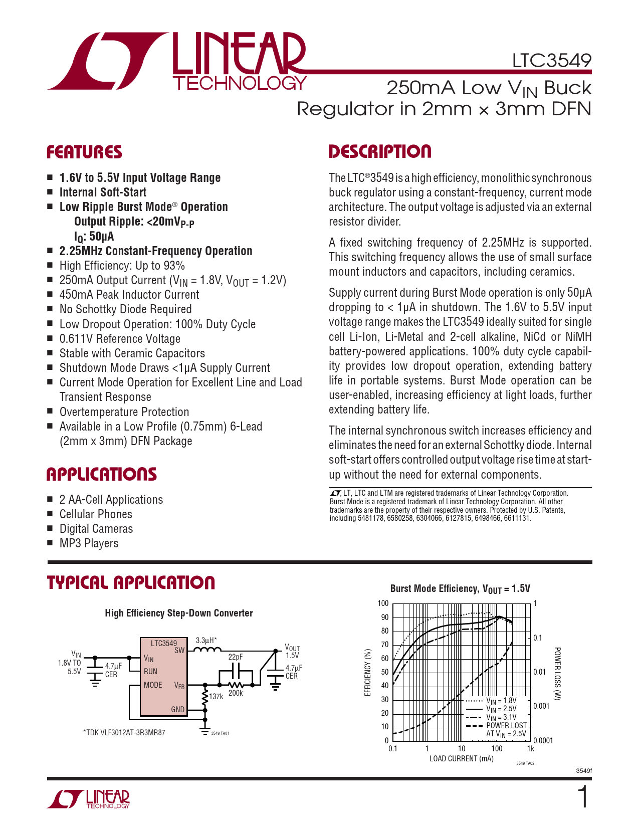 , LT, LTC and LTM are registered trademarks of Linear Technology Corporation. ■ 2 AA-Cell Applications Burst Mode is a registered trademark of Linear Technology Corporation. All other ■ Cellular Phones trademarks are the property of their respective owners. Protected by U.S. Patents, including 5481178, 6580258, 6304066, 6127815, 6498466, 6611131. ■ Digital Cameras ■ MP3 Players