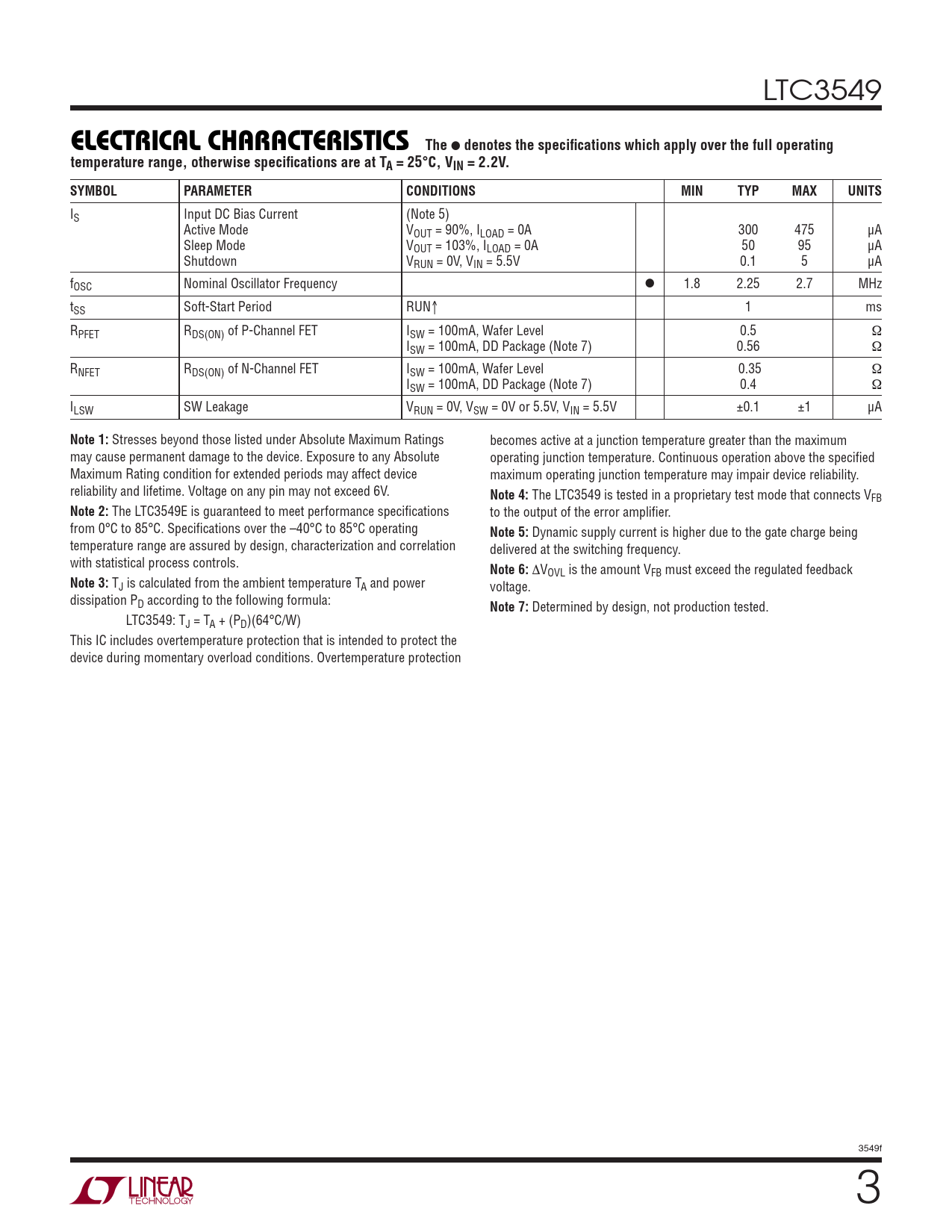 LTC3549 TheELECTRICAL CHARACTERISTICS ● denotes the specifi cations which apply over the full operatingtemperature range, otherwise specifi cations are at TA = 25°C, VIN = 2.2V.SYMBOLPARAMETERCONDITIONSMINTYPMAXUNITS IS Input DC Bias Current (Note 5) Active Mode VOUT = 90%, ILOAD = 0A 300 475 µA Sleep Mode VOUT = 103%, ILOAD = 0A 50 95 µA Shutdown VRUN = 0V, VIN = 5.5V 0.1 5 µA fOSC Nominal Oscillator Frequency ● 1.8 2.25 2.7 MHz tSS Soft-Start Period RUN↑ 1 ms RPFET RDS(ON) of P-Channel FET ISW = 100mA, Wafer Level 0.5 Ω ISW = 100mA, DD Package (Note 7) 0.56 Ω RNFET RDS(ON) of N-Channel FET ISW = 100mA, Wafer Level 0.35 Ω ISW = 100mA, DD Package (Note 7) 0.4 Ω ILSW SW Leakage VRUN = 0V, VSW = 0V or 5.5V, VIN = 5.5V ±0.1 ±1 µA Note 1: Stresses beyond those listed under Absolute Maximum Ratings becomes active at a junction temperature greater than the maximum may cause permanent damage to the device. Exposure to any Absolute operating junction temperature. Continuous operation above the specifi ed Maximum Rating condition for extended periods may affect device maximum operating junction temperature may impair device reliability. reliability and lifetime. Voltage on any pin may not exceed 6V. Note 4: The LTC3549 is tested in a proprietary test mode that connects VFB Note 2: The LTC3549E is guaranteed to meet performance specifi cations to the output of the error amplifi er. from 0°C to 85°C. Specifi cations over the –40°C to 85°C operating Note 5: Dynamic supply current is higher due to the gate charge being temperature range are assured by design, characterization and correlation delivered at the switching frequency. with statistical process controls. Note 6: ΔVOVL is the amount VFB must exceed the regulated feedback Note 3: TJ is calculated from the ambient temperature TA and power voltage. dissipation PD according to the following formula: Note 7: Determined by design, not production tested. LTC3549: TJ = TA + (PD)(64°C/W) This IC includes overtemperature protection that is intended to protect the device during momentary overload conditions. Overtemperature protection 3549f 3