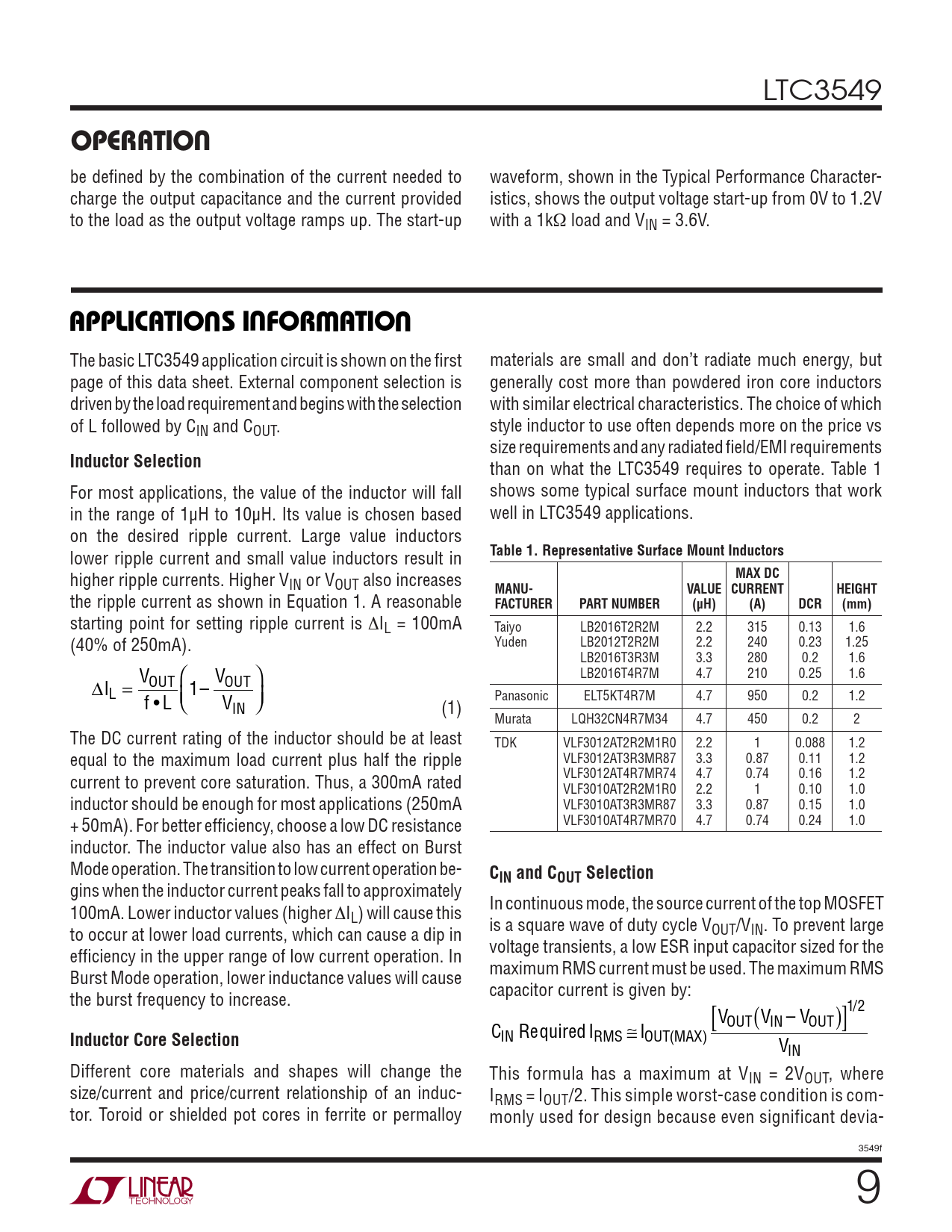 LTC3549 OPERATION be defi ned by the combination of the current needed to waveform, shown in the Typical Performance Character- charge the output capacitance and the current provided istics, shows the output voltage start-up from 0V to 1.2V to the load as the output voltage ramps up. The start-up with a 1kΩ load and VIN = 3.6V. UUWUAPPLICATIO S I FOR ATIO The basic LTC3549 application circuit is shown on the fi rst materials are small and don’t radiate much energy, but page of this data sheet. External component selection is generally cost more than powdered iron core inductors driven by the load requirement and begins with the selection with similar electrical characteristics. The choice of which of L followed by CIN and COUT. style inductor to use often depends more on the price vs size requirements and any radiated fi eld/EMI requirements Inductor Selection than on what the LTC3549 requires to operate. Table 1 For most applications, the value of the inductor will fall shows some typical surface mount inductors that work in the range of 1µH to 10µH. Its value is chosen based well in LTC3549 applications. on the desired ripple current. Large value inductors lower ripple current and small value inductors result in Table 1. Representative Surface Mount Inductors higher ripple currents. Higher V MAX DC IN or VOUT also increases MANU-VALUE CURRENTHEIGHT the ripple current as shown in Equation 1. A reasonable FACTURERPART NUMBER(µH)(A)DCR(mm) starting point for setting ripple current is ΔIL = 100mA Taiyo LB2016T2R2M 2.2 315 0.13 1.6 (40% of 250mA). Yuden LB2012T2R2M 2.2 240 0.23 1.25 LB2016T3R3M 3.3 280 0.2 1.6 V LB2016T4R7M 4.7 210 0.25 1.6 OUT ⎛ VOUT ⎞ ∆IL = 1– Panasonic ELT5KT4R7M 4.7 950 0.2 1.2 f • L ⎝⎜ VIN ⎠⎟ (1) Murata LQH32CN4R7M34 4.7 450 0.2 2 The DC current rating of the inductor should be at least TDK VLF3012AT2R2M1R0 2.2 1 0.088 1.2 equal to the maximum load current plus half the ripple VLF3012AT3R3MR87 3.3 0.87 0.11 1.2 VLF3012AT4R7MR74 4.7 0.74 0.16 1.2 current to prevent core saturation. Thus, a 300mA rated VLF3010AT2R2M1R0 2.2 1 0.10 1.0 inductor should be enough for most applications (250mA VLF3010AT3R3MR87 3.3 0.87 0.15 1.0 + 50mA). For better effi ciency, choose a low DC resistance VLF3010AT4R7MR70 4.7 0.74 0.24 1.0 inductor. The inductor value also has an effect on Burst Mode operation. The transition to low current operation be- CIN and COUT Selection gins when the inductor current peaks fall to approximately In continuous mode, the source current of the top MOSFET 100mA. Lower inductor values (higher ΔIL) will cause this is a square wave of duty cycle V to occur at lower load currents, which can cause a dip in OUT/VIN. To prevent large voltage transients, a low ESR input capacitor sized for the effi ciency in the upper range of low current operation. In maximum RMS current must be used. The maximum RMS Burst Mode operation, lower inductance values will cause capacitor current is given by: the burst frequency to increase. / V V – V [ OUT( IN OUT)]12 C Required I ≅ I Inductor Core Selection IN RMS OUT MAX ( ) VIN Different core materials and shapes will change the This formula has a maximum at VIN = 2VOUT, where size/current and price/current relationship of an induc- IRMS = IOUT/2. This simple worst-case condition is com- tor. Toroid or shielded pot cores in ferrite or permalloy monly used for design because even significant devia- 3549f 9