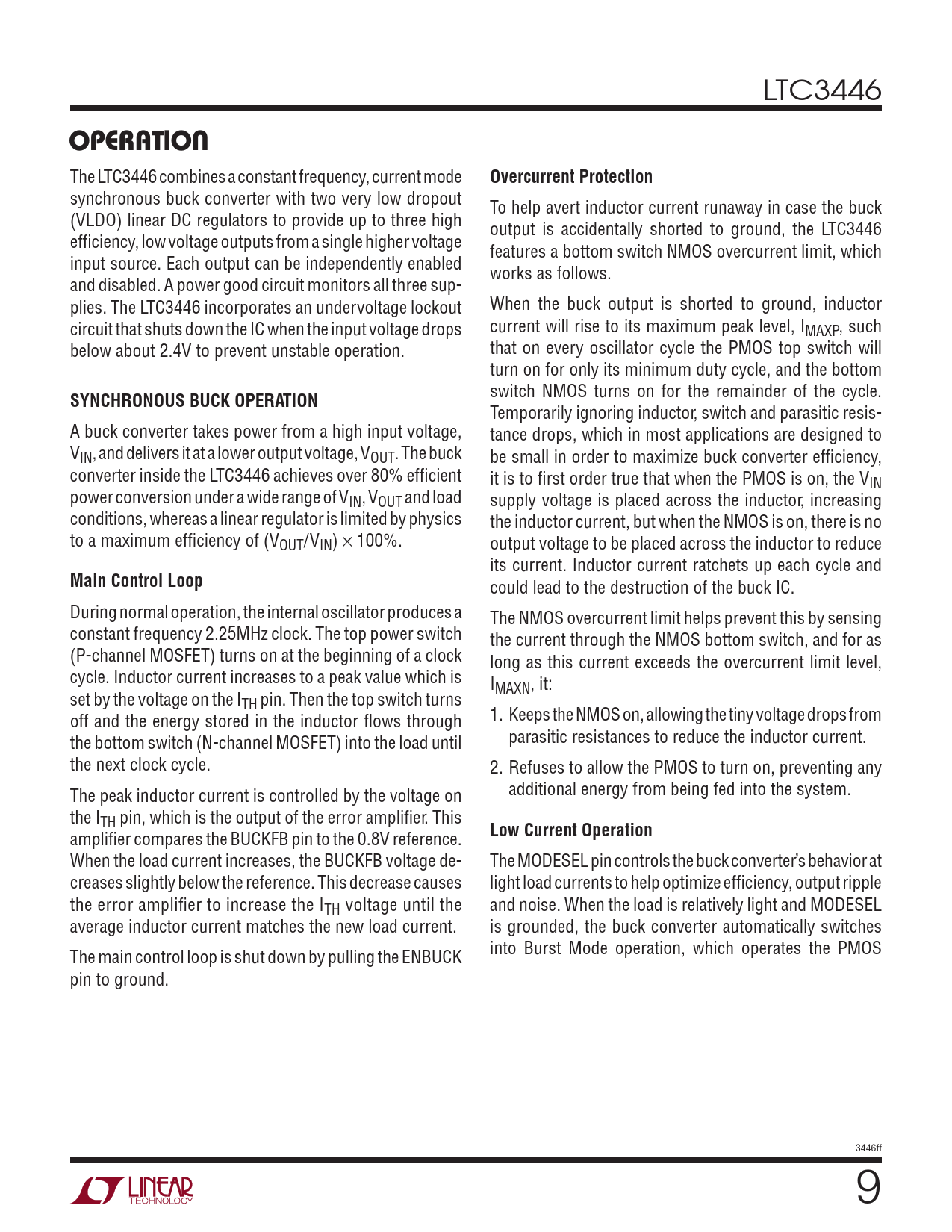 synchronous buck converter with two very low dropout To help avert inductor current runaway in case the buck (VLDO) linear DC regulators to provide up to three high output is accidentally shorted to ground, the LTC3446 efficiency, low voltage outputs from a single higher voltage features a bottom switch NMOS overcurrent limit, which input source. Each output can be independently enabled works as follows. and disabled. A power good circuit monitors all three sup- plies. The LTC3446 incorporates an undervoltage lockout When the buck output is shorted to ground, inductor circuit that shuts down the IC when the input voltage drops current will rise to its maximum peak level, IMAXP, such below about 2.4V to prevent unstable operation. that on every oscillator cycle the PMOS top switch will turn on for only its minimum duty cycle, and the bottom