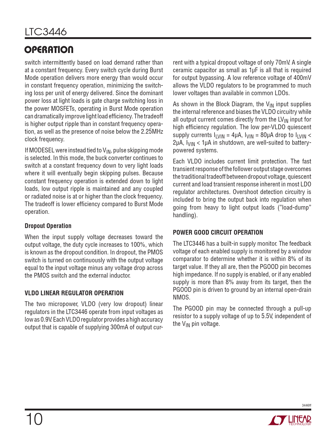 LTC3446 operaTion switch intermittently based on load demand rather than rent with a typical dropout voltage of only 70mV. A single at a constant frequency. Every switch cycle during Burst ceramic capacitor as small as 1µF is all that is required Mode operation delivers more energy than would occur for output bypassing. A low reference voltage of 400mV in constant frequency operation, minimizing the switch- allows the VLDO regulators to be programmed to much ing loss per unit of energy delivered. Since the dominant lower voltages than available in common LDOs. power loss at light loads is gate charge switching loss in As shown in the Block Diagram, the V the power MOSFETs, operating in Burst Mode operation IN input supplies the internal reference and biases the VLDO circuitry while can dramatically improve light load efficiency. The tradeoff all output current comes directly from the LV is higher output ripple than in constant frequency opera- IN input for high efficiency regulation. The low per-VLDO quiescent tion, as well as the presence of noise below the 2.25MHz supply currents I clock frequency. LVIN = 4µA, IVIN = 80µA drop to ILVIN < 2µA, IVIN < 1µA in shutdown, are well-suited to battery- If MODESEL were instead tied to VIN, pulse skipping mode powered systems. is selected. In this mode, the buck converter continues to Each VLDO includes current limit protection. The fast switch at a constant frequency down to very light loads transient response of the follower output stage overcomes where it will eventually begin skipping pulses. Because the traditional tradeoff between dropout voltage, quiescent constant frequency operation is extended down to light current and load transient response inherent in most LDO loads, low output ripple is maintained and any coupled regulator architectures. Overshoot detection circuitry is or radiated noise is at or higher than the clock frequency. included to bring the output back into regulation when The tradeoff is lower efficiency compared to Burst Mode going from heavy to light output loads (“load-dump” operation. handling). Dropout OperationPOWER GOOD CIRCUIT OPERATION When the input supply voltage decreases toward the output voltage, the duty cycle increases to 100%, which The LTC3446 has a built-in supply monitor. The feedback is known as the dropout condition. In dropout, the PMOS voltage of each enabled supply is monitored by a window switch is turned on continuously with the output voltage comparator to determine whether it is within 8% of its equal to the input voltage minus any voltage drop across target value. If they all are, then the PGOOD pin becomes the PMOS switch and the external inductor. high impedance. If no supply is enabled, or if any enabled supply is more than 8% away from its target, then the VLDO LINEAR REGULATOR OPERATION PGOOD pin is driven to ground by an internal open-drain NMOS. The two micropower, VLDO (very low dropout) linear regulators in the LTC3446 operate from input voltages as The PGOOD pin may be connected through a pull-up low as 0.9V. Each VLDO regulator provides a high accuracy resistor to a supply voltage of up to 5.5V, independent of output that is capable of supplying 300mA of output cur- the VIN pin voltage. 3446ff 10 Document Outline Features Applications Description Typical Application Absolute Maximum Ratings Pin Configuration Order Information Electrical Characteristics Typical Performance Characteristics Pin Functions Block Diagram Operation Applications Information Package Description Revision History Typical Application Related Parts