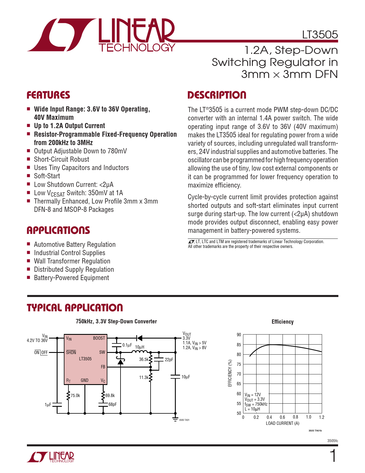 LT3505 1.2A, Step-Down Switching Regulator in 3mm × 3mm DFN FEATURES DESCRIPTION !