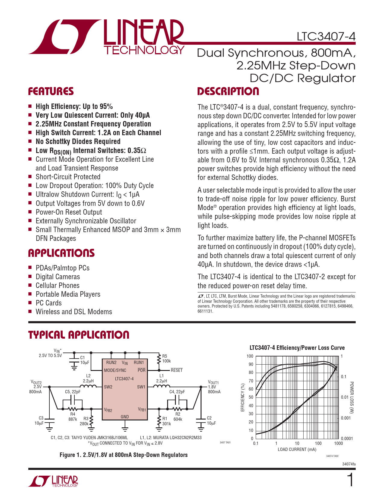 LTC3407-4 Dual Synchronous, 800mA, 2.25MHz Step-Down DC/DC Regulator FEATURESDESCRIPTION n High Effi ciency: Up to 95% The LTC®3407-4 is a dual, constant frequency, synchro- n Very Low Quiescent Current: Only 40μA nous step down DC/DC converter. Intended for low power n 2.25MHz Constant Frequency Operation applications, it operates from 2.5V to 5.5V input voltage n High Switch Current: 1.2A on Each Channel range and has a constant 2.25MHz switching frequency, n No Schottky Diodes Required allowing the use of tiny, low cost capacitors and induc- n Low RDS(ON) Internal Switches: 0.35 Ω tors with a profi le ≤1mm. Each output voltage is adjust- n Current Mode Operation for Excellent Line able from 0.6V to 5V. Internal synchronous 0.35Ω, 1.2A and Load Transient Response power switches provide high effi ciency without the need n Short-Circuit Protected for external Schottky diodes. n Low Dropout Operation: 100% Duty Cycle A user selectable mode input is provided to allow the user n Ultralow Shutdown Current: IQ < 1μA to trade-off noise ripple for low power effi ciency. Burst n Output Voltages from 5V down to 0.6V Mode® operation provides high effi ciency at light loads, n Power-On Reset Output while pulse-skipping mode provides low noise ripple at n Externally Synchronizable Oscillator light loads. n Small Thermally Enhanced MSOP and 3mm × 3mm DFN Packages To further maximize battery life, the P-channel MOSFETs are turned on continuously in dropout (100% duty cycle), APPLICATIONS and both channels draw a total quiescent current of only 40μA. In shutdown, the device draws <1μA. n PDAs/Palmtop PCs n Digital Cameras The LTC3407-4 is identical to the LTC3407-2 except for n Cellular Phones the reduced power-on reset delay time. n Portable Media Players L, LT, LTC, LTM, Burst Mode, Linear Technology and the Linear logo are registered trademarks n PC Cards of Linear Technology Corporation. All other trademarks are the property of their respective owners. Protected by U.S. Patents including 5481178, 6580258, 6304066, 6127815, 6498466, n Wireless and DSL Modems 6611131. TYPICAL APPLICATIONLTC3407-4 Effi ciency/Power Loss Curve VIN* 2.5V TO 5.5V R5 100 1 C1 10μF RUN2 V 100k IN RUN1 90 MODE/SYNC POR RESET 80 L2 L1 0.1 LTC3407-4 V 2.2μH 2.2μH 70 POWER LOSS (W) OUT2 VOUT1 2.5V SW2 SW1 1.8V 60 800mA C5, 22pF C4, 22pF 800mA 50 0.01 40 V V FB2 FB1 EFFICIENCY (%) R4 R2 30 GND C3 R3 R1 C2 0.001 887k 604k 20 10μF 280k 301k 10μF 10 C1, C2, C3: TAIYO YUDEN JMK316BJ106ML L1, L2: MURATA LQH32CN2R2M33 0 0.0001 3407 TA01 *VOUT CONNECTED TO VIN FOR VIN ≤ 2.8V 0.1 1 10 100 1000 LOAD CURRENT (mA) Figure 1. 2.5V/1.8V at 800mA Step-Down Regulators 34074 TA02 34074fa 1