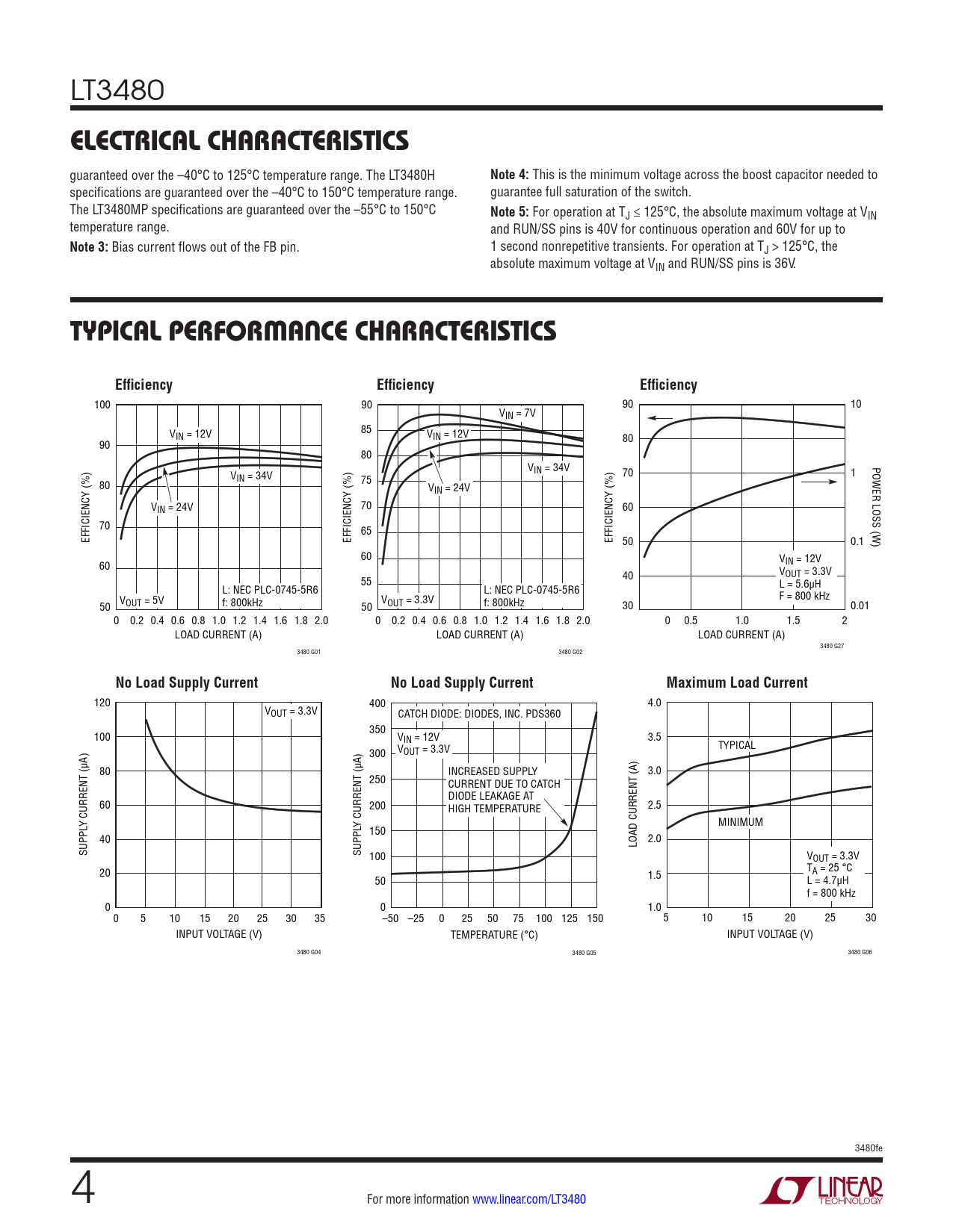 LT3480 ELECTRICAL CHARACTERISTICS guaranteed over the –40°C to 125°C temperature range. The LT3480H Note 4: This is the minimum voltage across the boost capacitor needed to specifications are guaranteed over the –40°C to 150°C temperature range. guarantee full saturation of the switch. The LT3480MP specifications are guaranteed over the –55°C to 150°C Note 5: For operation at TJ ≤ 125°C, the absolute maximum voltage at VIN temperature range. and RUN/SS pins is 40V for continuous operation and 60V for up to Note 3: Bias current flows out of the FB pin. 1 second nonrepetitive transients. For operation at TJ > 125°C, the absolute maximum voltage at VIN and RUN/SS pins is 36V. TYPICAL PERFORMANCE CHARACTERISTICSEfficiencyEfficiencyEfficiency 100 90 90 10 VIN = 7V V 85 IN = 12V VIN = 12V 90 80 80 V POWER LOSS (W) V IN = 34V IN = 34V 70 1 80 75 VIN = 24V VIN = 24V 70 60 70 65 EFFICIENCY (%) EFFICIENCY (%) EFFICIENCY (%) 50 0.1 60 V 60 IN = 12V VOUT = 3.3V 55 40 L: NEC PLC-0745-5R6 L: NEC PLC-0745-5R6 L = 5.6µH V F = 800 kHz 50 VOUT = 5V f: 800kHz 50 OUT = 3.3V f: 800kHz 30 0.01 0 0.2 0.4 0.6 0.8 1.0 1.2 1.4 1.6 1.8 2.0 0 0.2 0.4 0.6 0.8 1.0 1.2 1.4 1.6 1.8 2.0 0 0.5 1.0 1.5 2 LOAD CURRENT (A) LOAD CURRENT (A) LOAD CURRENT (A) 3480 G27 3480 G01 3480 G02 No Load Supply CurrentNo Load Supply CurrentMaximum Load Current 120 400 4.0 VOUT = 3.3V CATCH DIODE: DIODES, INC. PDS360 350 100 VIN = 12V 3.5 TYPICAL 300 VOUT = 3.3V 80 INCREASED SUPPLY 3.0 250 CURRENT DUE TO CATCH DIODE LEAKAGE AT 60 200 HIGH TEMPERATURE 2.5 Y CURRENT (µA) Y CURRENT (µA) MINIMUM 150 40 LOAD CURRENT (A) 2.0 SUPPL SUPPL 100 VOUT = 3.3V 20 TA = 25 °C 50 1.5 L = 4.7µH f = 800 kHz 0 0 1.0 0 5 10 15 20 25 30 35 –50 –25 0 25 50 75 100 125 150 5 10 15 20 25 30 INPUT VOLTAGE (V) TEMPERATURE (°C) INPUT VOLTAGE (V) 3480 G04 3480 G05 3480 G06 3480fe 4 For more information www.linear.com/LT3480 Document Outline Features Description Applications Typical Application Absolute Maximum Ratings Pin Configuration Electrical Characteristics Typical Performance Characteristics Pin Functions Block Diagram Operation Applications Information Typical Applications Package Description Revision History Typical Application Related Parts