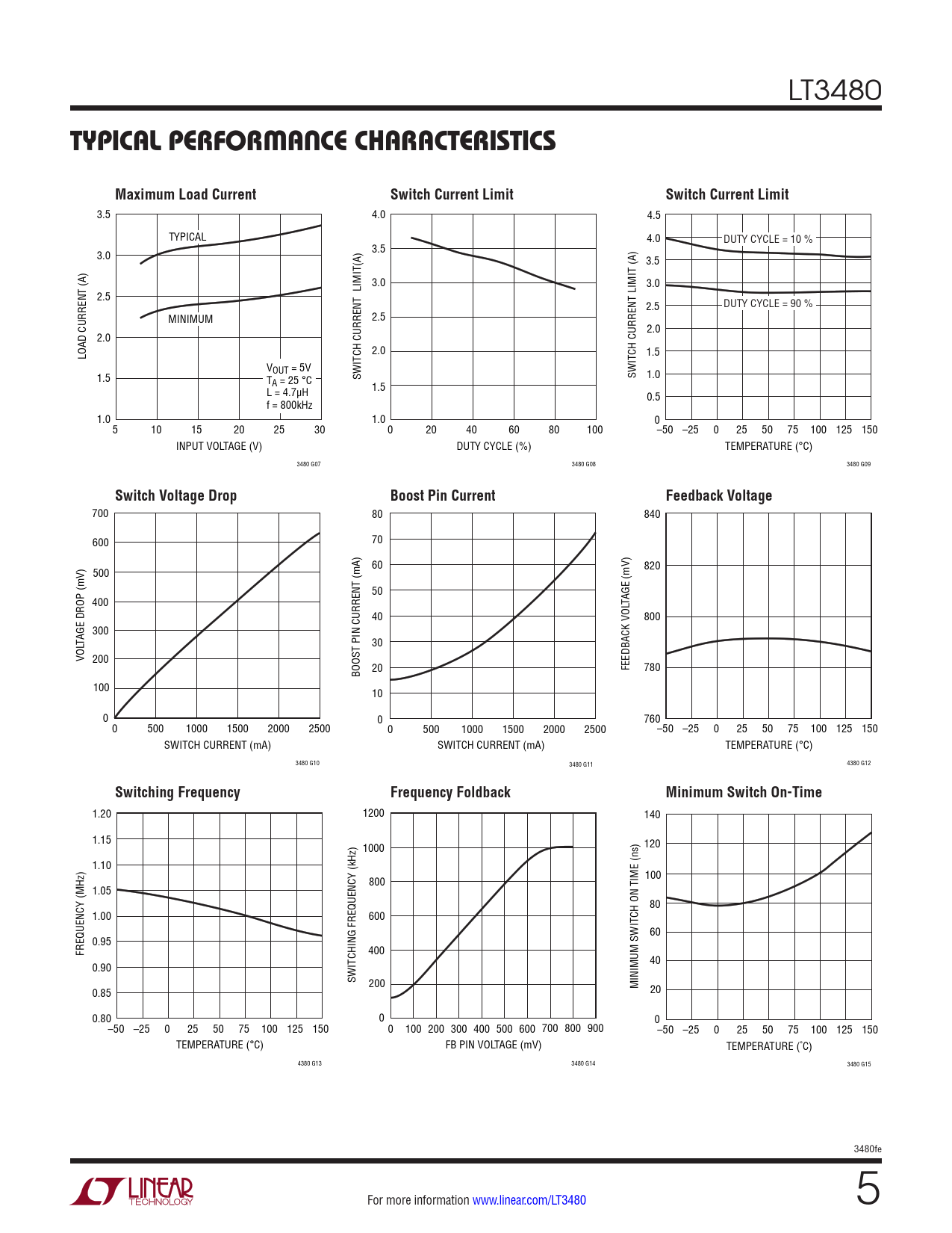 3.5 4.0 4.5 TYPICAL 4.0 DUTY CYCLE = 10 % 3.0 3.5 3.5 3.0 3.0 2.5 2.5 DUTY CYCLE = 90 % MINIMUM 2.5 2.0 2.0 LOAD CURRENT (A) 2.0 1.5 VOUT = 5V 1.5 T SWITCH CURRENT LIMIT(A) SWITCH CURRENT LIMIT (A) 1.0 A = 25 °C L = 4.7µH 1.5 0.5 f = 800kHz 1.0 1.0 0 5 10 15 20 25 30 0 20 40 60 80 100 –50 –25 0 25 50 75 100 125 150 INPUT VOLTAGE (V) DUTY CYCLE (%) TEMPERATURE (°C) 3480 G07 3480 G08 3480 G09