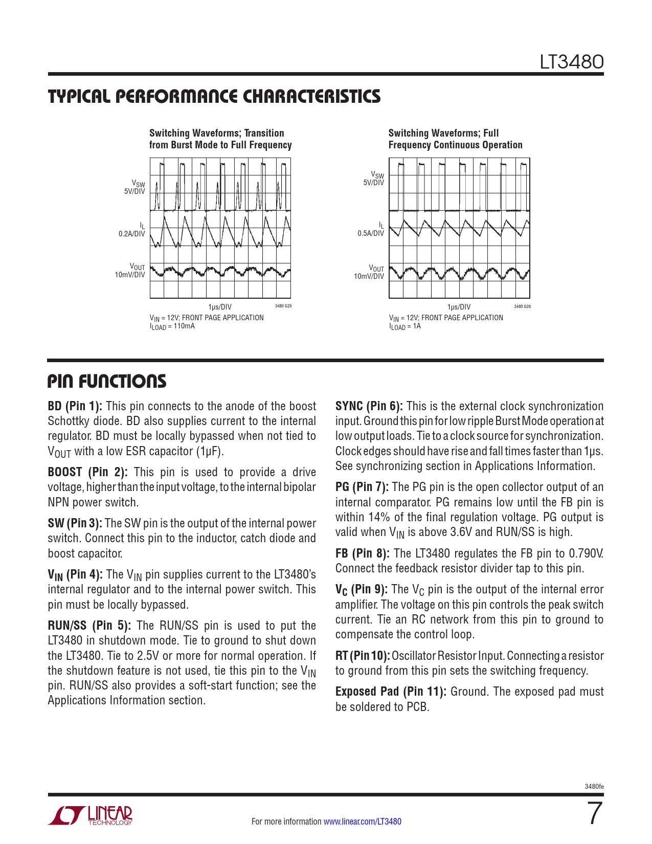 VSW VSW 5V/DIV 5V/DIV IL IL 0.2A/DIV 0.5A/DIV VOUT VOUT 10mV/DIV 10mV/DIV 3480 G25 1µs/DIV 3480 G26 1µs/DIV VIN = 12V; FRONT PAGE APPLICATION VIN = 12V; FRONT PAGE APPLICATION ILOAD = 110mA ILOAD = 1A