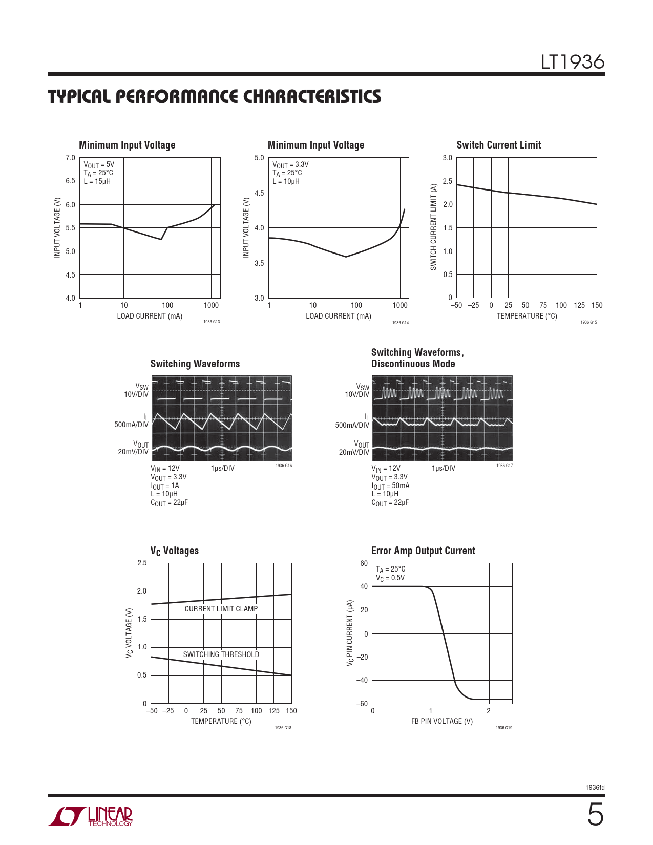 7.0 5.0 3.0 VOUT = 5V VOUT = 3.3V TA = 25°C TA = 25°C 6.5 L = 15μH L = 10μH 2.5 4.5 6.0 2.0 5.5 4.0 1.5 5.0 1.0 INPUT VOLTAGE (V) INPUT VOLTAGE (V) 3.5 SWITCH CURRENT LIMIT (A) 4.5 0.5 4.0 3.0 0 1 10 100 1000 1 10 100 1000 –50 –25 0 25 50 75 100 125 150 LOAD CURRENT (mA) LOAD CURRENT (mA) TEMPERATURE (°C) 1936 G13 1936 G14 1936 G15