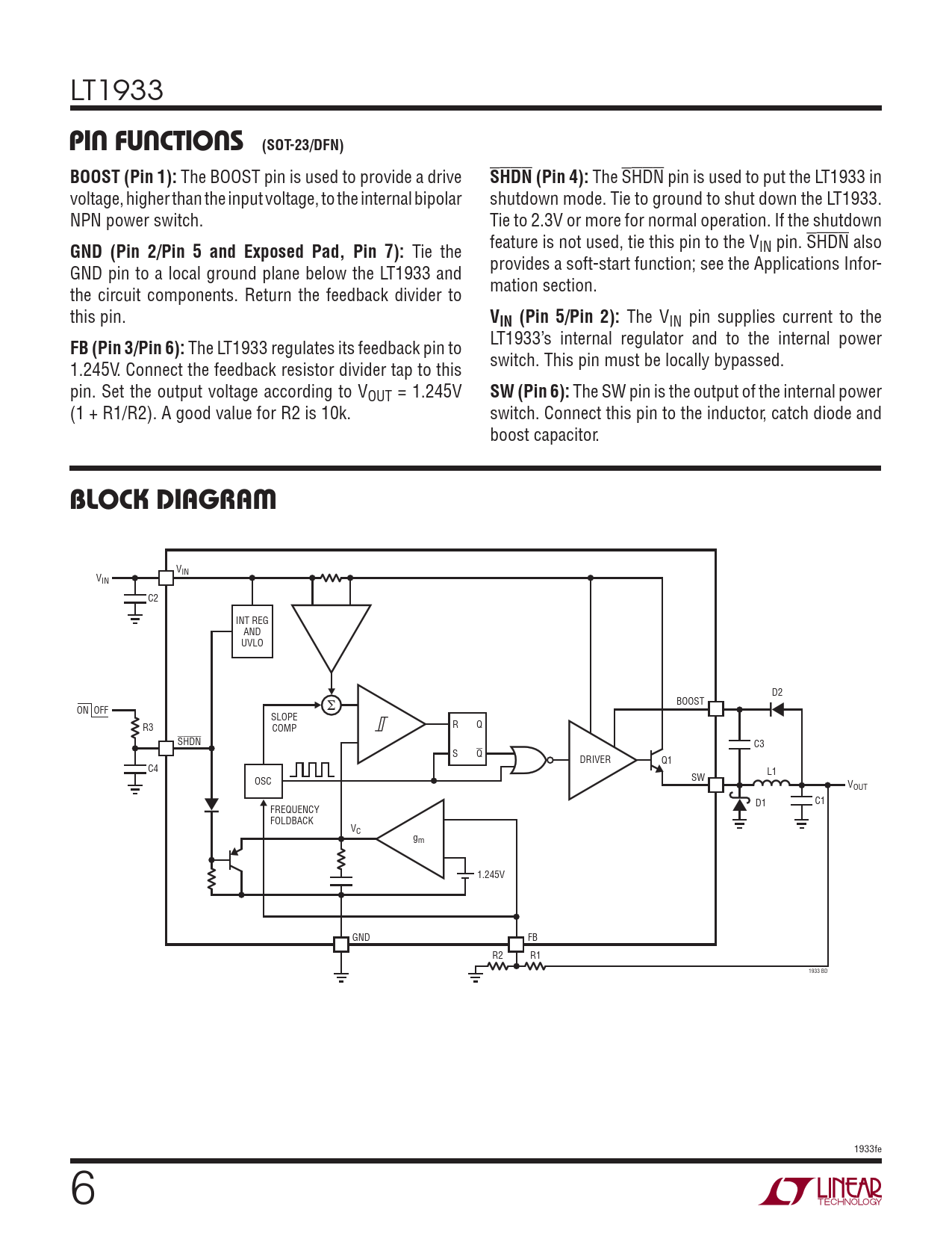 VIN VIN C2 INT REG AND UVLO D2 Σ BOOST ON OFF SLOPE R R3 COMP Q SHDN C3 S Q DRIVER Q1 C4 L1 OSC SW VOUT C1 D1 FREQUENCY FOLDBACK VC gm 1.245V GND FB R2 R1 1933 BD 1933fe 6