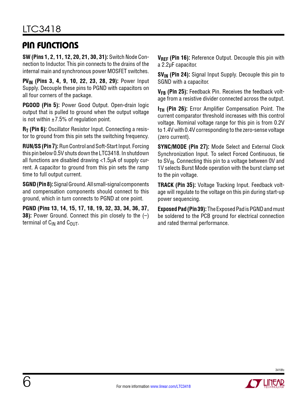 Power Ground. Connect this pin closely to the (–) be soldered to the PCB ground for electrical connection terminal of CIN and COUT. and rated thermal performance. 3418fc 6 For more information www.linear.com/LTC3418 Document Outline Description Typical Application Absolute Maximum Ratings Pin Configuration Electrical Characteristics Typical Performance Characteristics Pin Functions Block Diagram Operation Applications Information Package Description Typical Application Related Parts