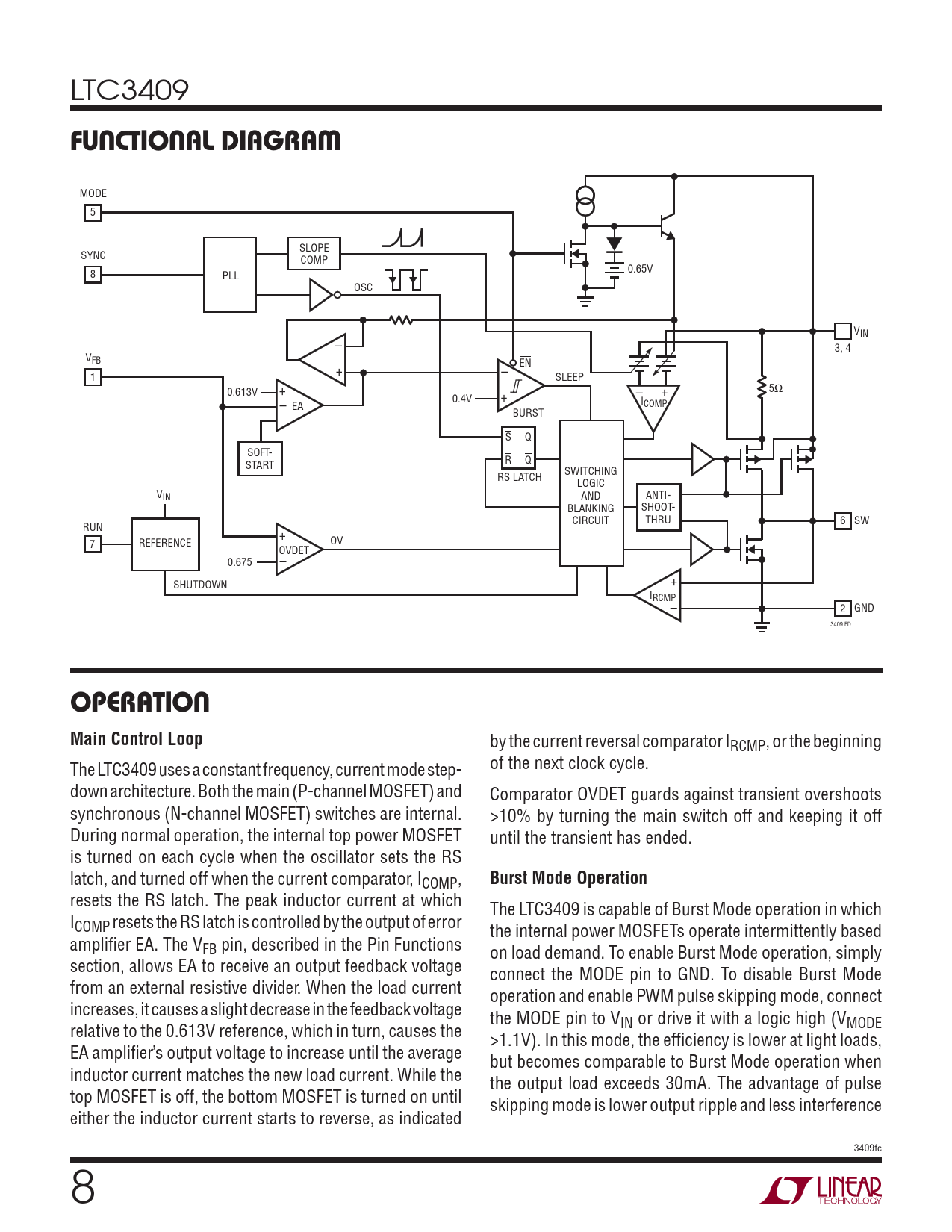 MODE 5 SLOPE SYNC COMP 0.65V 8 PLL OSC VIN – 3, 4 VFB EN + – 1 SLEEP + 0.613V 5Ω – 0.4V + – + I EA COMP BURST S Q SOFT- R Q START SWITCHING RS LATCH LOGIC VIN AND ANTI- BLANKING SHOOT- CIRCUIT THRU 6 SW RUN + 7 REFERENCE OV OVDET 0.675 – + SHUTDOWN IRCMP– 2 GND 3409 FD