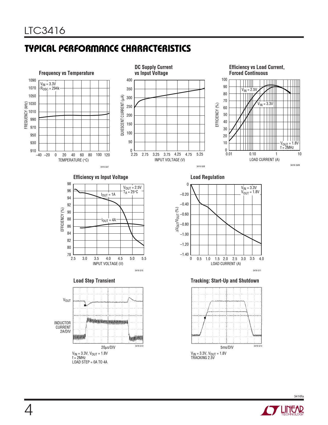 VOUT INDUCTOR CURRENT 2A/DIV 3416 G12 20µs/DIV 3416 G13 5ms/DIV VIN = 3.3V, VOUT = 1.8V VIN = 3.3V, VOUT = 1.8V f = 2MHz TRACKING 2.5V LOAD STEP = 0A TO 4A 3416fa 4