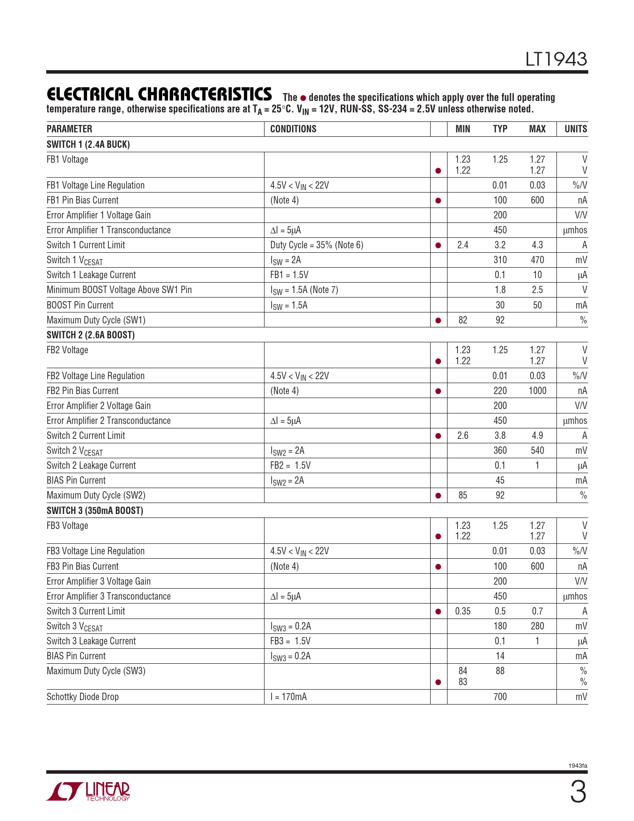 FB3 Voltage 1.23 1.25 1.27 V ● 1.22 1.27 V FB3 Voltage Line Regulation 4.5V < VIN < 22V 0.01 0.03 %/V FB3 Pin Bias Current (Note 4) ● 100 600 nA Error Amplifier 3 Voltage Gain 200 V/V Error Amplifier 3 Transconductance ∆I = 5µA 450 µmhos Switch 3 Current Limit ● 0.35 0.5 0.7 A Switch 3 VCESAT ISW3 = 0.2A 180 280 mV Switch 3 Leakage Current FB3 = 1.5V 0.1 1 µA BIAS Pin Current ISW3 = 0.2A 14 mA Maximum Duty Cycle (SW3) 84 88 % ● 83 % Schottky Diode Drop I = 170mA 700 mV 1943fa 3