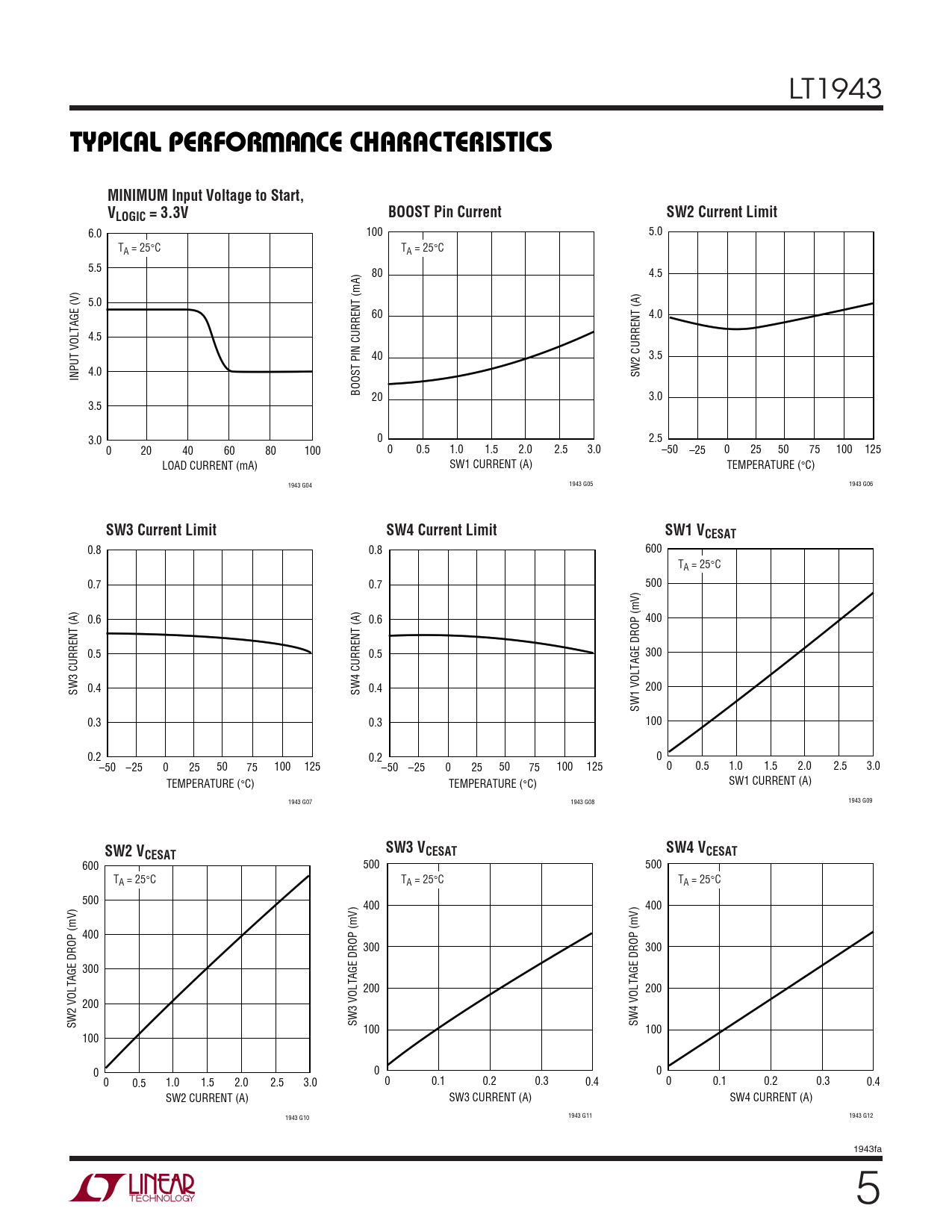 0.8 0.8 600 TA = 25°C 0.7 0.7 500 0.6 0.6 400 0.5 0.5 300 0.4 0.4 200 SW3 CURRENT (A) SW4 CURRENT (A) SW1 VOLTAGE DROP (mV) 0.3 0.3 100 0.2 0.2 0 –50 –25 0 25 50 75 100 125 –50 –25 0 25 50 75 100 125 0 0.5 1.0 1.5 2.0 2.5 3.0 SW1 CURRENT (A) TEMPERATURE (°C) TEMPERATURE (°C) 1943 G09 1943 G07 1943 G08