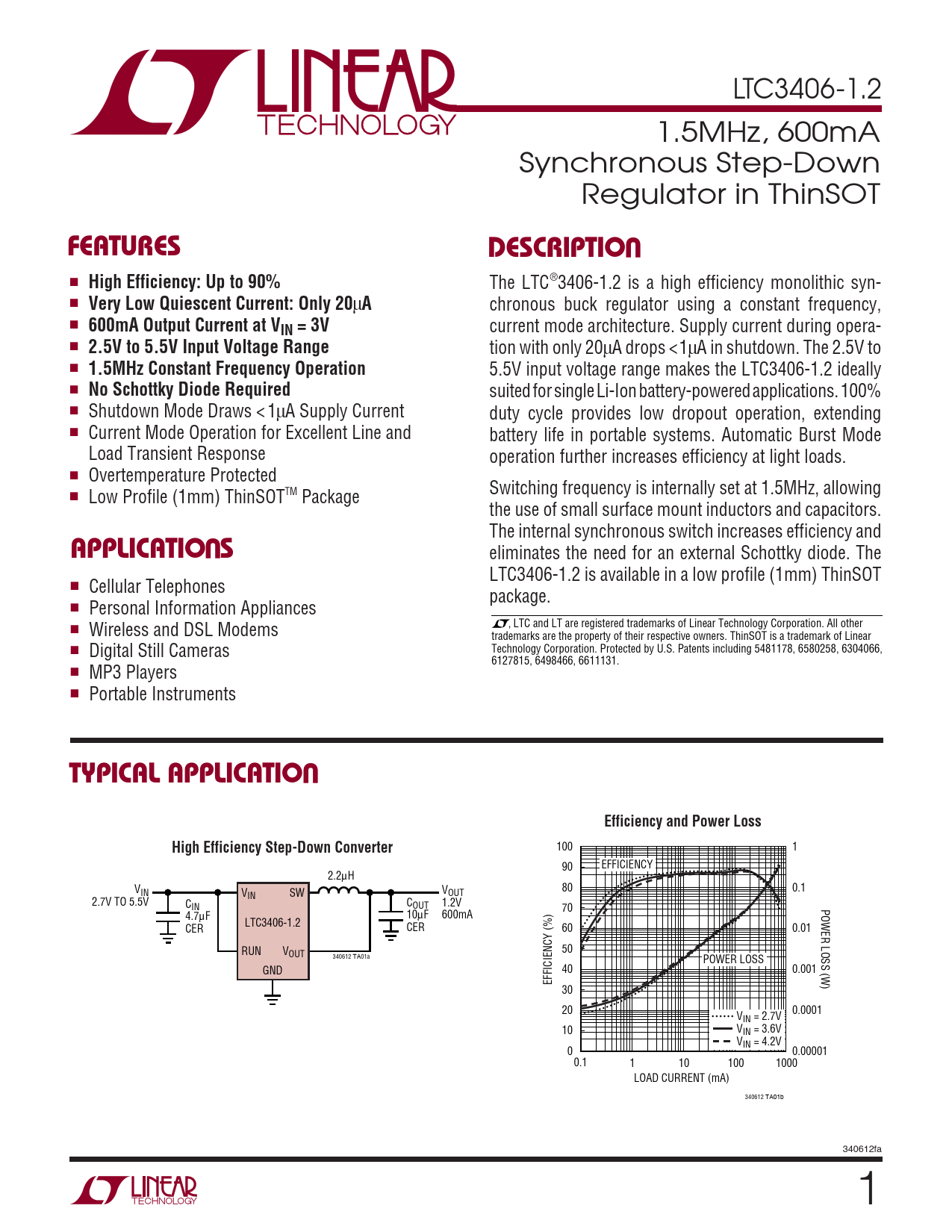eliminates the need for an external Schottky diode. The LTC3406-1.2 is available in a low profile (1mm) ThinSOT ■ Cellular Telephones package. ■ Personal Information Appliances ■ Wireless and DSL Modems , LTC and LT are registered trademarks of Linear Technology Corporation. All other trademarks are the property of their respective owners. ThinSOT is a trademark of Linear ■ Digital Still Cameras Technology Corporation. Protected by U.S. Patents including 5481178, 6580258, 6304066, 6127815, 6498466, 6611131. ■ MP3 Players ■ Portable Instruments