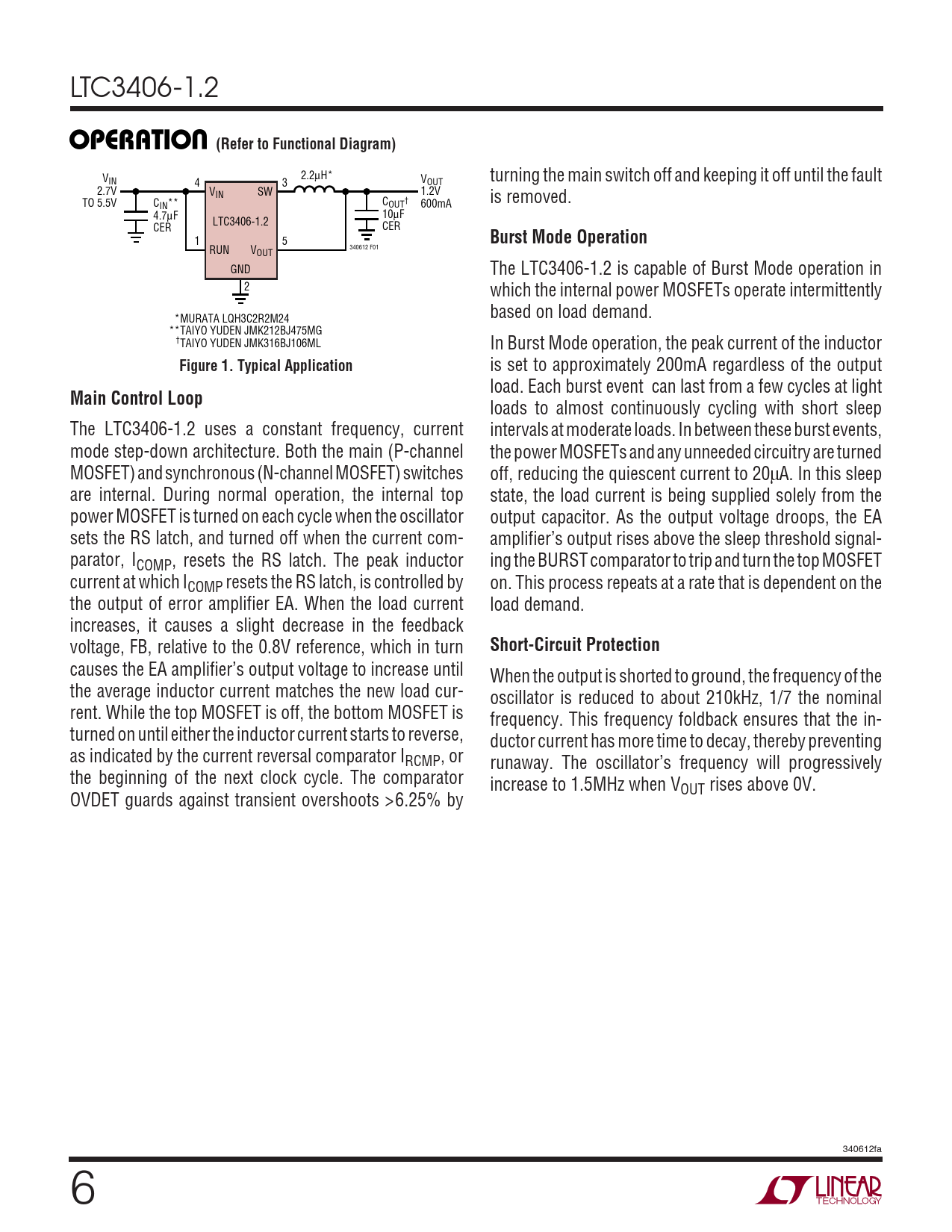 RUN 340612 F01 VOUT GND The LTC3406-1.2 is capable of Burst Mode operation in 2 which the internal power MOSFETs operate intermittently based on load demand. *MURATA LQH3C2R2M24 **TAIYO YUDEN JMK212BJ475MG †TAIYO YUDEN JMK316BJ106ML In Burst Mode operation, the peak current of the inductor