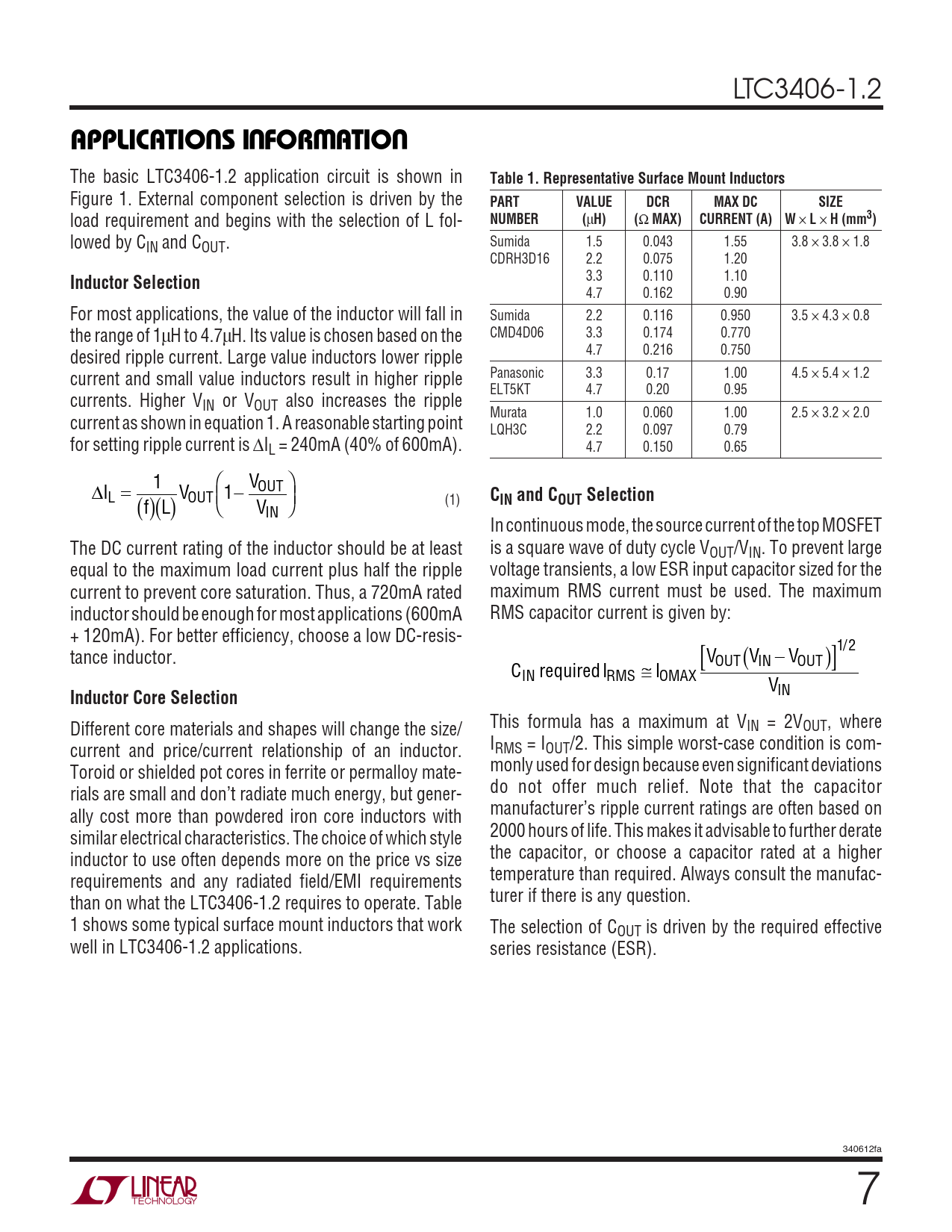 IN Different core materials and shapes will change the size/ This formula has a maximum at VIN = 2VOUT, where current and price/current relationship of an inductor. IRMS = IOUT/2. This simple worst-case condition is com- Toroid or shielded pot cores in ferrite or permalloy mate- monly used for design because even significant deviations rials are small and don’t radiate much energy, but gener- do not offer much relief. Note that the capacitor ally cost more than powdered iron core inductors with manufacturer’s ripple current ratings are often based on similar electrical characteristics. The choice of which style 2000 hours of life. This makes it advisable to further derate inductor to use often depends more on the price vs size the capacitor, or choose a capacitor rated at a higher requirements and any radiated field/EMI requirements temperature than required. Always consult the manufac- than on what the LTC3406-1.2 requires to operate. Table turer if there is any question. 1 shows some typical surface mount inductors that work The selection of COUT is driven by the required effective well in LTC3406-1.2 applications. series resistance (ESR). 340612fa 7