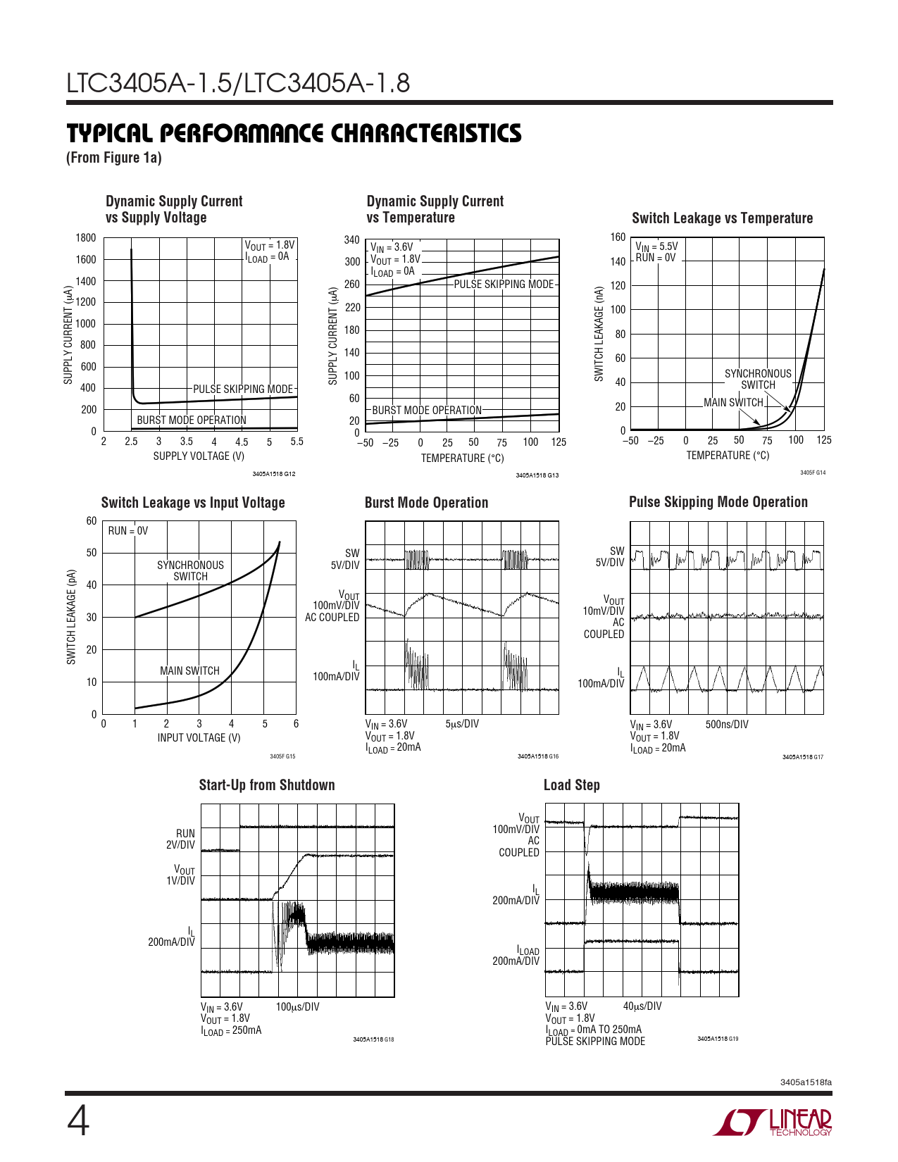 1800 160 340 VOUT = 1.8V V V IN = 3.6V IN = 5.5V 1600 ILOAD = 0A 300 VOUT = 1.8V 140 RUN = 0V ILOAD = 0A 1400 260 PULSE SKIPPING MODE 120 A) A) µ 1200 µ 220 100 1000 180 80 800 140 60 600 SYNCHRONOUS 100 SUPPLY CURRENT ( SWITCH LEAKAGE (nA) SUPPLY CURRENT ( 40 400 PULSE SKIPPING MODE SWITCH 60 MAIN SWITCH 200 20 BURST MODE OPERATION BURST MODE OPERATION 20 0 0 0 2 2.5 3 3.5 4 4.5 5 5.5 –50 50 100 125 –25 0 25 50 75 100 125 –50 –25 0 25 75 SUPPLY VOLTAGE (V) TEMPERATURE ( TEMPERATURE ( °C) °C) 3405A1518 G12 3405F G14 3405A1518 G13
