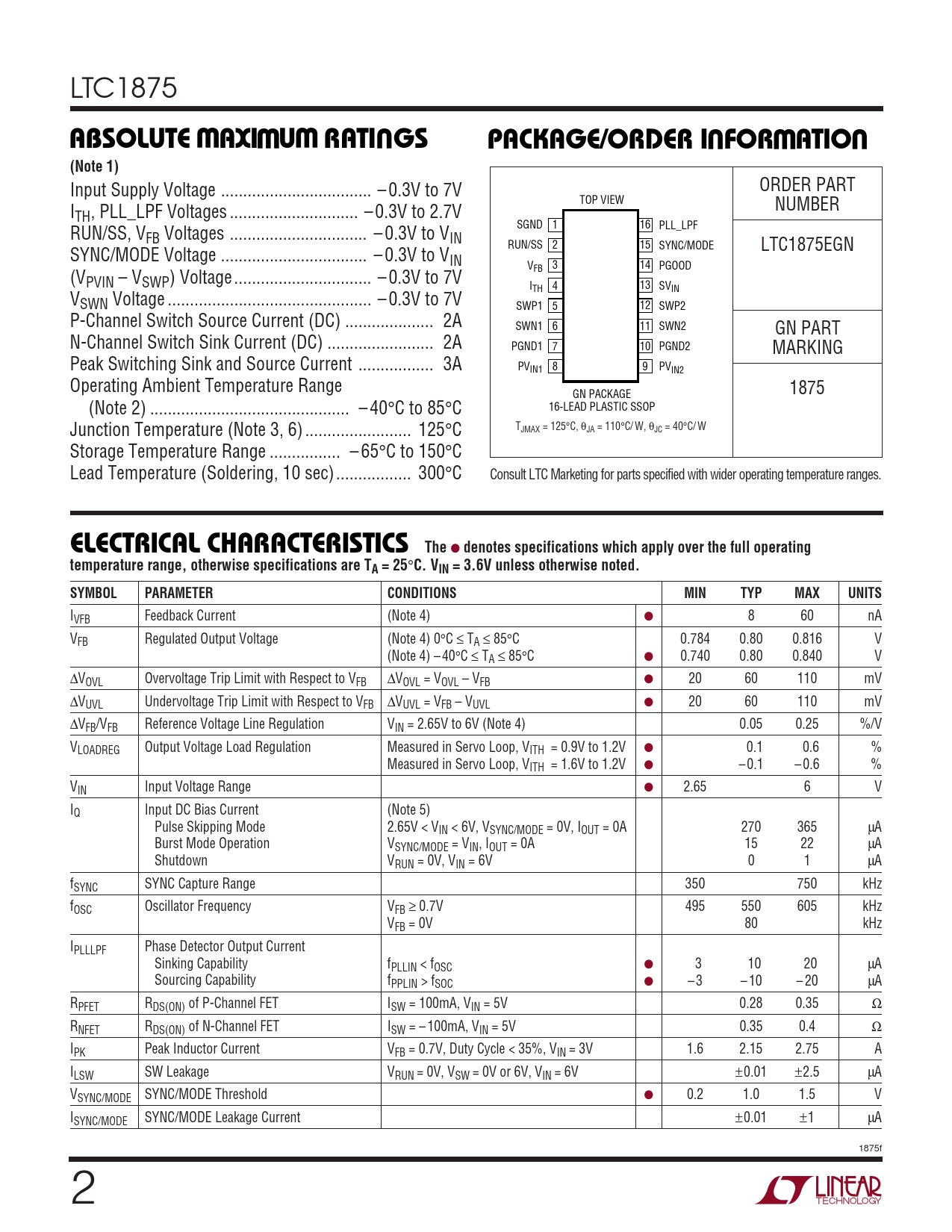 IVFB Feedback Current (Note 4) ● 8 60 nA VFB Regulated Output Voltage (Note 4) 0°C ≤ TA ≤ 85°C 0.784 0.80 0.816 V (Note 4) – 40°C ≤ TA ≤ 85°C ● 0.740 0.80 0.840 V ∆VOVL Overvoltage Trip Limit with Respect to VFB ∆VOVL = VOVL – VFB ● 20 60 110 mV ∆VUVL Undervoltage Trip Limit with Respect to VFB ∆VUVL = VFB – VUVL ● 20 60 110 mV ∆VFB/VFB Reference Voltage Line Regulation VIN = 2.65V to 6V (Note 4) 0.05 0.25 %/V VLOADREG Output Voltage Load Regulation Measured in Servo Loop, VITH = 0.9V to 1.2V ● 0.1 0.6 % Measured in Servo Loop, VITH = 1.6V to 1.2V ● – 0.1 – 0.6 % VIN Input Voltage Range ● 2.65 6 V IQ Input DC Bias Current (Note 5) Pulse Skipping Mode 2.65V < VIN < 6V, VSYNC/MODE = 0V, IOUT = 0A 270 365 µA Burst Mode Operation VSYNC/MODE = VIN, IOUT = 0A 15 22 µA Shutdown VRUN = 0V, VIN = 6V 0 1 µA fSYNC SYNC Capture Range 350 750 kHz fOSC Oscillator Frequency VFB ≥ 0.7V 495 550 605 kHz VFB = 0V 80 kHz IPLLLPF Phase Detector Output Current Sinking Capability fPLLIN < fOSC ● 3 10 20 µA Sourcing Capability fPPLIN > fSOC ● – 3 – 10 – 20 µA RPFET RDS(ON) of P-Channel FET ISW = 100mA, VIN = 5V 0.28 0.35 Ω RNFET RDS(ON) of N-Channel FET ISW = – 100mA, VIN = 5V 0.35 0.4 Ω IPK Peak Inductor Current VFB = 0.7V, Duty Cycle < 35%, VIN = 3V 1.6 2.15 2.75 A ILSW SW Leakage VRUN = 0V, VSW = 0V or 6V, VIN = 6V ±0.01 ±2.5 µA VSYNC/MODE SYNC/MODE Threshold ● 0.2 1.0 1.5 V ISYNC/MODE SYNC/MODE Leakage Current ±0.01 ±1 µA 1875f 2