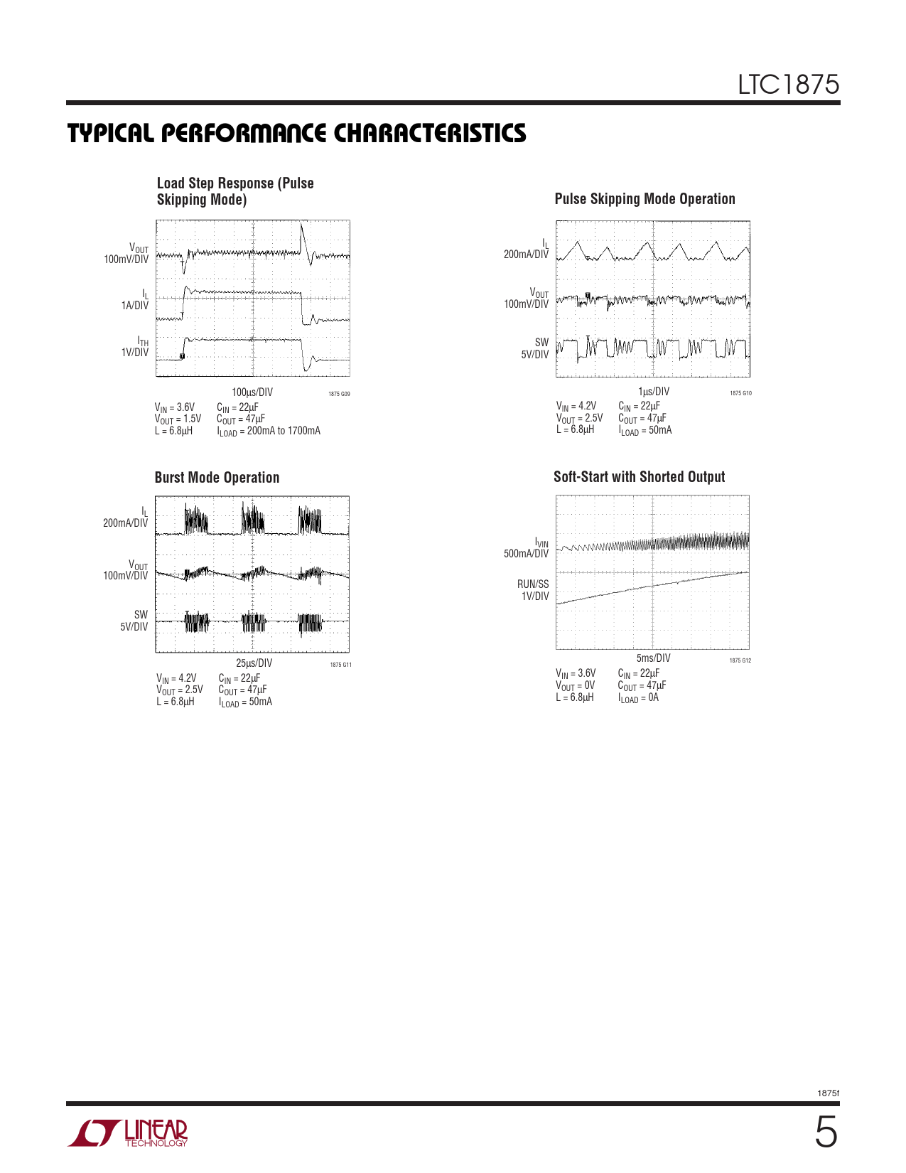 IL VOUT 200mA/DIV 100mV/DIV I VOUT L 1A/DIV 100mV/DIV ITH SW 1V/DIV 5V/DIV 100µs/DIV 1875 G09 1µs/DIV 1875 G10 VIN = 3.6V CIN = 22µF VIN = 4.2V CIN = 22µF VOUT = 1.5V COUT = 47µF VOUT = 2.5V COUT = 47µF L = 6.8µH ILOAD = 200mA to 1700mA L = 6.8µH ILOAD = 50mA