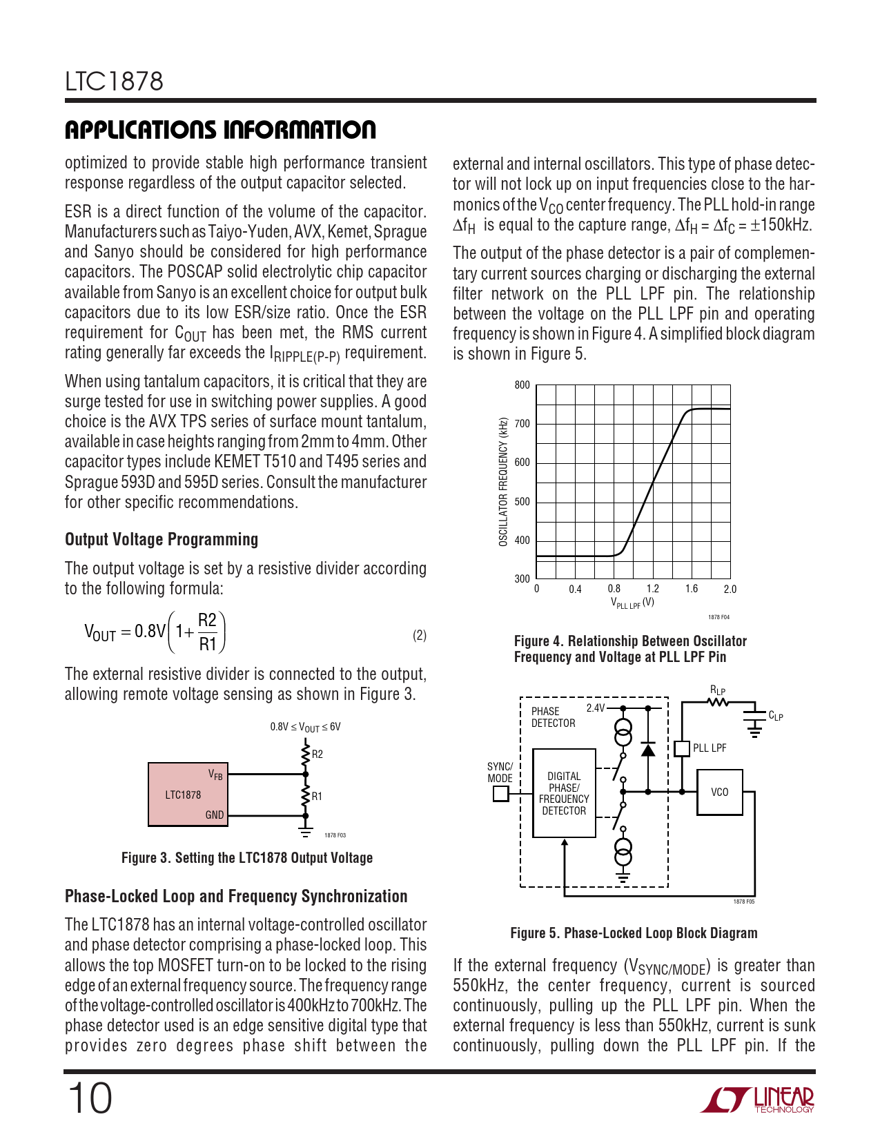 400 OSCILLATOR FREQUENCY (kHz) The output voltage is set by a resistive divider according 300 to the following formula: 0 0.4 0.8 1.2 1.6 2.0 V (V) PLL LPF  R2 1878 F04 V = 0 8 . V 1+ OUT  (2) R  1