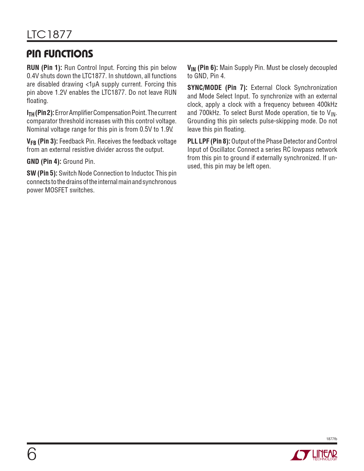 Páginas / Página18 / 6 — PIN FUNCTIONS. RUN (Pin 1):. VIN (Pin 6):. SYNC/MODE (Pin 7):. ITH (Pin …