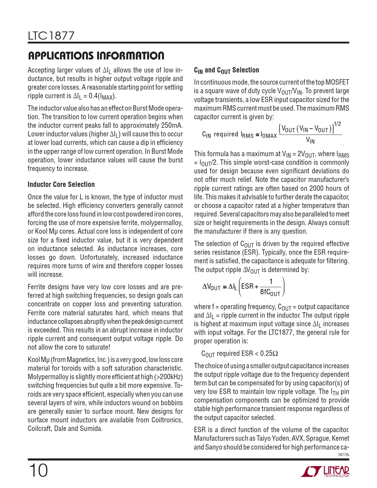 LTC1877 APPLICATIONS INFORMATION Accepting larger values of ΔIL allows the use of low in- CIN and COUT Selection ductance, but results in higher output voltage ripple and In continuous mode, the source current of the top MOSFET greater core losses. A reasonable starting point for setting is a square wave of duty cycle V ripple current is ΔI OUT/VIN. To prevent large L = 0.4(IMAX). voltage transients, a low ESR input capacitor sized for the The inductor value also has an effect on Burst Mode opera- maximum RMS current must be used. The maximum RMS tion. The transition to low current operation begins when capacitor current is given by: the inductor current peaks fall to approximately 250mA. ⎡ 1/2 V ⎣ ⎤ OUT ( VIN − VOUT )⎦ Lower inductor values (higher ΔIL) will cause this to occur CIN required IRMS ≅ IOMAX at lower load currents, which can cause a dip in effi ciency VIN in the upper range of low current operation. In Burst Mode This formula has a maximum at VIN = 2VOUT, where IRMS operation, lower inductance values will cause the burst = IOUT/2. This simple worst-case condition is commonly frequency to increase. used for design because even signifi cant deviations do not offer much relief. Note the capacitor manufacturer’s Inductor Core Selection ripple current ratings are often based on 2000 hours of Once the value for L is known, the type of inductor must life. This makes it advisable to further derate the capacitor, be selected. High effi ciency converters generally cannot or choose a capacitor rated at a higher temperature than afford the core loss found in low cost powdered iron cores, required. Several capacitors may also be paralleled to meet forcing the use of more expensive ferrite, molypermalloy, size or height requirements in the design. Always consult or Kool Mμ cores. Actual core loss is independent of core the manufacturer if there is any question. size for a fi xed inductor value, but it is very dependent The selection of C on inductance selected. As inductance increases, core OUT is driven by the required effective series resistance (ESR). Typically, once the ESR require- losses go down. Unfortunately, increased inductance ment is satisfi ed, the capacitance is adequate for fi ltering. requires more turns of wire and therefore copper losses The output ripple ΔV will increase. OUT is determined by: ⎛ 1 ⎞ Ferrite designs have very low core losses and are pre- ΔVOUT ≅ ΔIL ES ⎜ R + ⎟ ferred at high switching frequencies, so design goals can ⎝ 8fC OUT ⎠ concentrate on copper loss and preventing saturation. where f = operating frequency, COUT = output capacitance Ferrite core material saturates hard, which means that and ΔIL = ripple current in the inductor. The output ripple inductance collapses abruptly when the peak design current is highest at maximum input voltage since ΔIL increases is exceeded. This results in an abrupt increase in inductor with input voltage. For the LTC1877, the general rule for ripple current and consequent output voltage ripple. Do proper operation is: not allow the core to saturate! COUT required ESR < 0.25Ω Kool Mμ (from Magnetics, Inc.) is a very good, low loss core material for toroids with a soft saturation characteristic. The choice of using a smaller output capacitance increases Molypermalloy is slightly more effi cient at high (>200kHz) the output ripple voltage due to the frequency dependent switching frequencies but quite a bit more expensive. To- term but can be compensated for by using capacitor(s) of roids are very space effi cient, especially when you can use very low ESR to maintain low ripple voltage. The ITH pin several layers of wire, while inductors wound on bobbins compensation components can be optimized to provide are generally easier to surface mount. New designs for stable high performance transient response regardless of surface mount inductors are available from Coiltronics, the output capacitor selected. Coilcraft, Dale and Sumida. ESR is a direct function of the volume of the capacitor. Manufacturers such as Taiyo Yuden, AVX, Sprague, Kemet and Sanyo should be considered for high performance ca- 1877fb 10