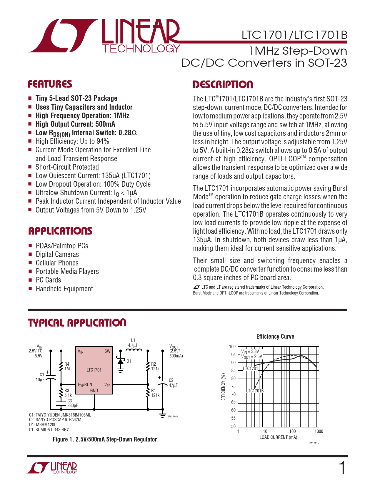 LTC1701/LTC1701B 1MHz Step-Down DC/DC Converters in SOT-23 UFEATURESDESCRIPTIO ■ Tiny 5-Lead SOT-23 Package The LTC®1701/LTC1701B are the industry’s first SOT-23 ■ Uses Tiny Capacitors and Inductor step-down, current mode, DC/DC converters. Intended for ■ High Frequency Operation: 1MHz low to medium power applications, they operate from 2.5V ■ High Output Current: 500mA to 5.5V input voltage range and switch at 1MHz, allowing ■ Low RDS(ON) Internal Switch: 0.28 Ω the use of tiny, low cost capacitors and inductors 2mm or ■ High Efficiency: Up to 94% less in height. The output voltage is adjustable from 1.25V ■ Current Mode Operation for Excellent Line to 5V. A built-in 0.28Ω switch allows up to 0.5A of output and Load Transient Response current at high efficiency. OPTI-LOOPTM compensation ■ Short-Circuit Protected allows the transient response to be optimized over a wide ■ Low Quiescent Current: 135µA (LTC1701) range of loads and output capacitors. ■ Low Dropout Operation: 100% Duty Cycle The LTC1701 incorporates automatic power saving Burst ■ Ultralow Shutdown Current: IQ < 1µA ModeTM operation to reduce gate charge losses when the ■ Peak Inductor Current Independent of Inductor Value load current drops below the level required for continuous ■ Output Voltages from 5V Down to 1.25V operation. The LTC1701B operates continuously to very U low load currents to provide low ripple at the expense of APPLICATIO S light load efficiency. With no load, the LTC1701 draws only 135µA. In shutdown, both devices draw less than 1µA, ■ PDAs/Palmtop PCs making them ideal for current sensitive applications. ■ Digital Cameras ■ Cellular Phones Their small size and switching frequency enables a ■ Portable Media Players complete DC/DC converter function to consume less than ■ PC Cards 0.3 square inches of PC board area. ■ Handheld Equipment , LTC and LT are registered trademarks of Linear Technology Corporation. Burst Mode and OPTI-LOOP are trademarks of Linear Technology Corporation. UTYPICAL APPLICATIONEfficiency Curve L1 V 4.7µH V IN OUT 100 2.5V TO VIN SW (2.5V/ VIN = 3.3V 5.5V 500mA) 95 VOUT = 2.5V D1 R4 R2 90 1M LTC1701 LTC1701 + 121k 85 C1 + 10µF C2 80 ITH/RUN VFB 47µF 75 R3 GND R1 LTC1701B 5.1k 121k 70 C3 EFFICIENCY (%) 65 330pF 60 C1: TAIYO YUDEN JMK316BJ106ML 1701 F01a C2: SANYO POSCAP 6TPA47M 55 D1: MBRM120L 50 L1: SUMIDA CD43-4R7 1 10 100 1000 Figure 1. 2.5V/500mA Step-Down Regulator LOAD CURRENT (mA) 1701 F01b 1
