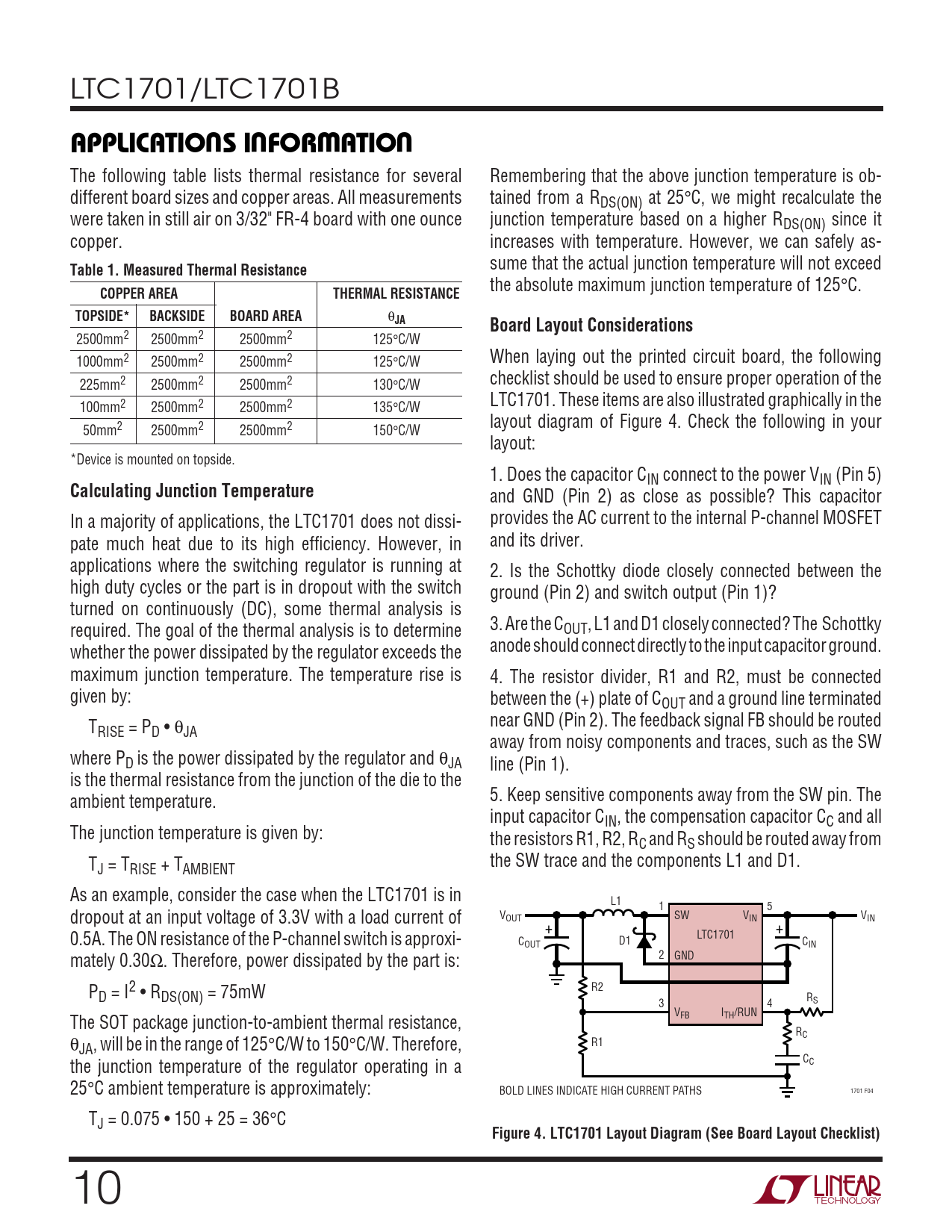 2500mm2 2500mm2 2500mm2 125°C/W 1000mm2 2500mm2 2500mm2 125°C/W When laying out the printed circuit board, the following 225mm2 2500mm2 2500mm2 130°C/W checklist should be used to ensure proper operation of the LTC1701. These items are also illustrated graphically in the 100mm2 2500mm2 2500mm2 135°C/W layout diagram of Figure 4. Check the following in your 50mm2 2500mm2 2500mm2 150°C/W layout: *Device is mounted on topside. 1. Does the capacitor CIN connect to the power VIN (Pin 5)