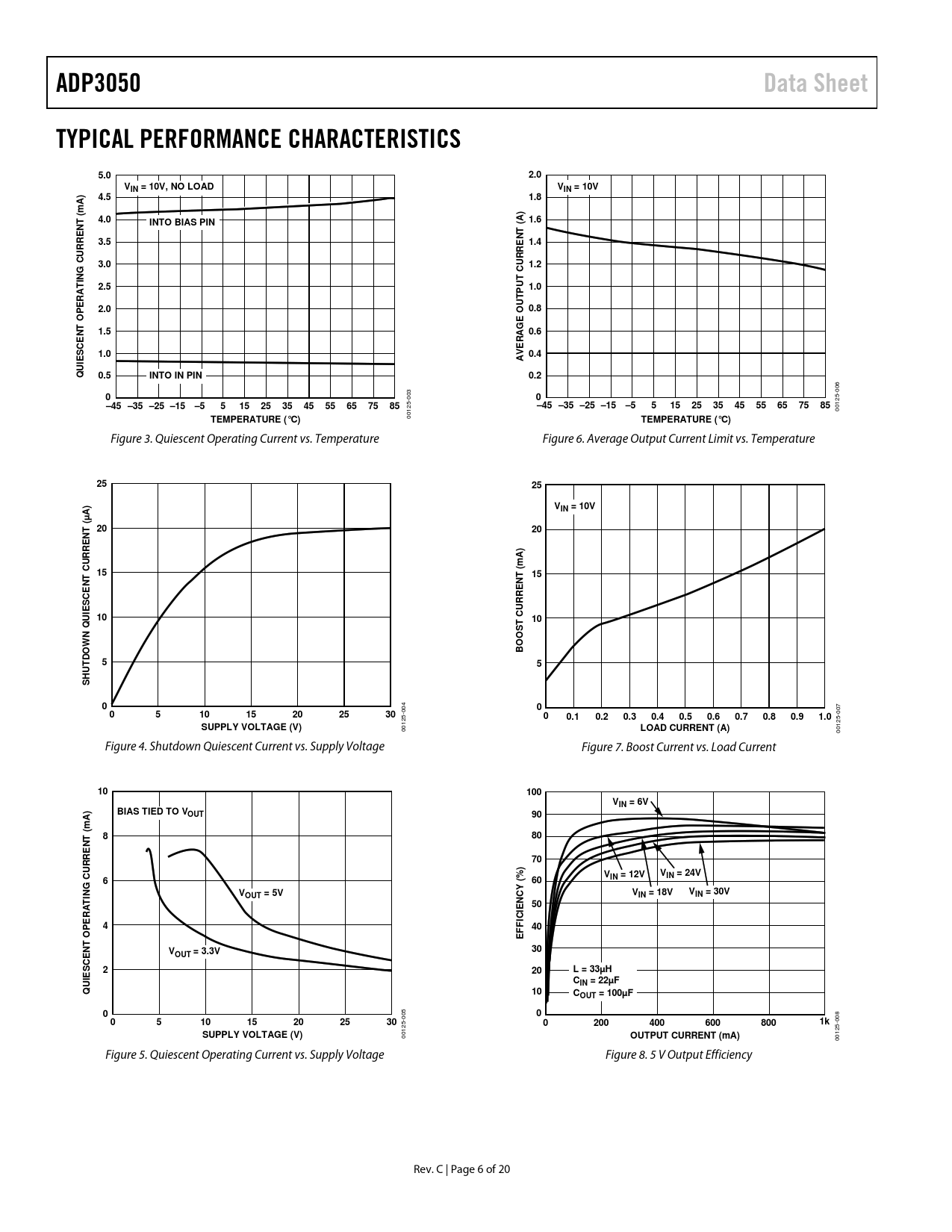 00125- Figure 5. Quiescent Operating Current vs. Supply Voltage Figure 8. 5 V Output Efficiency Rev. C | Page 6 of 20 Document Outline Features Applications Functional Block Diagram General Description Revision History Specifications Absolute Maximum Ratings ESD Caution Pin Configuration and Function Descriptions Typical Performance Characteristics Theory of Operation Setting the Output Voltage Applications Information ADIsimPower Design Tool Inductor Selection Continuous Mode Discontinuous Mode Inductor Core Types and Materials Choosing an Inductor Output Capacitor Selection Choosing an Output Capacitor Catch Diode Selection Choosing a Catch Diode Input Capacitor Selection Discontinous Mode Ringing Setting the Output Voltage Frequency Compensation Current Limit/Frequency Foldback Bias Pin Connection Boosted Drive Stage Start-Up/Minimum Input Voltage Thermal Considerations Board Layout Guidelines Typical Applications 5 V to 3.3 V Buck (Step-Down) Regulator Inverting (Buck Boost) Regulator Dual Output SEPIC Regulator Outline Dimensions Ordering Guide