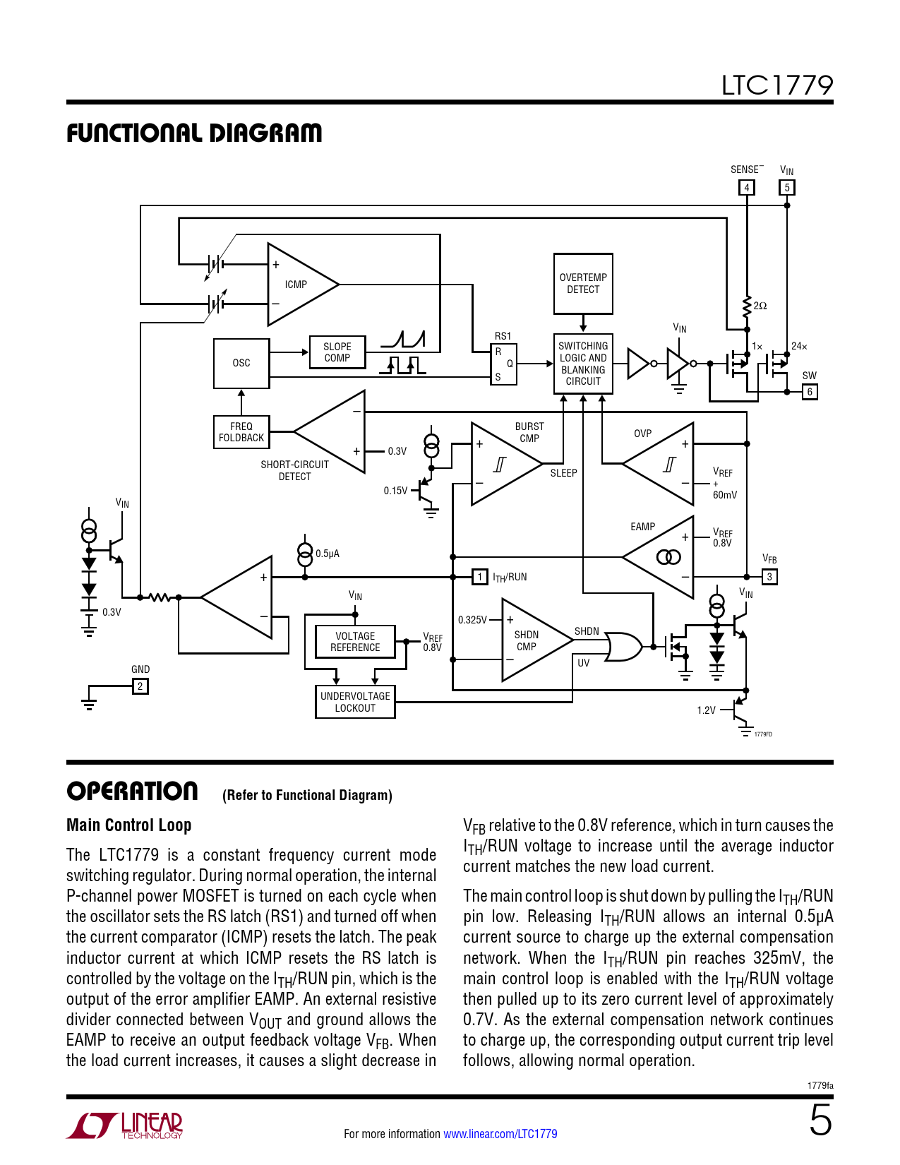 LTC1779 FuncTional DiagraM SENSE– VIN 4 5 + OVERTEMP ICMP DETECT – 2Ω VIN RS1 SLOPE SWITCHING R 1× 24× COMP LOGIC AND OSC Q BLANKING S CIRCUIT SW 6 – FREQ BURST FOLDBACK + + OVP CMP + 0.3V SHORT-CIRCUIT SLEEP DETECT VREF – – + 0.15V 60mV VIN EAMP VREF + 0.8V 0.5µA VFB + 1 ITH/RUN – 3 V V IN IN 0.3V – 0.325V + SHDN VOLTAGE VREF SHDN REFERENCE 0.8V CMP – UV GND 2 UNDERVOLTAGE LOCKOUT 1.2V 1779FD operaTion (Refer to Functional Diagram) Main Control Loop VFB relative to the 0.8V reference, which in turn causes the The LTC1779 is a constant frequency current mode ITH/RUN voltage to increase until the average inductor switching regulator. During normal operation, the internal current matches the new load current. P-channel power MOSFET is turned on each cycle when The main control loop is shut down by pulling the ITH/RUN the oscillator sets the RS latch (RS1) and turned off when pin low. Releasing ITH/RUN allows an internal 0.5µA the current comparator (ICMP) resets the latch. The peak current source to charge up the external compensation inductor current at which ICMP resets the RS latch is network. When the ITH/RUN pin reaches 325mV, the controlled by the voltage on the ITH/RUN pin, which is the main control loop is enabled with the ITH/RUN voltage output of the error amplifier EAMP. An external resistive then pulled up to its zero current level of approximately divider connected between VOUT and ground allows the 0.7V. As the external compensation network continues EAMP to receive an output feedback voltage VFB. When to charge up, the corresponding output current trip level the load current increases, it causes a slight decrease in follows, allowing normal operation. 1779fa For more information www.linear.com/LTC1779 5