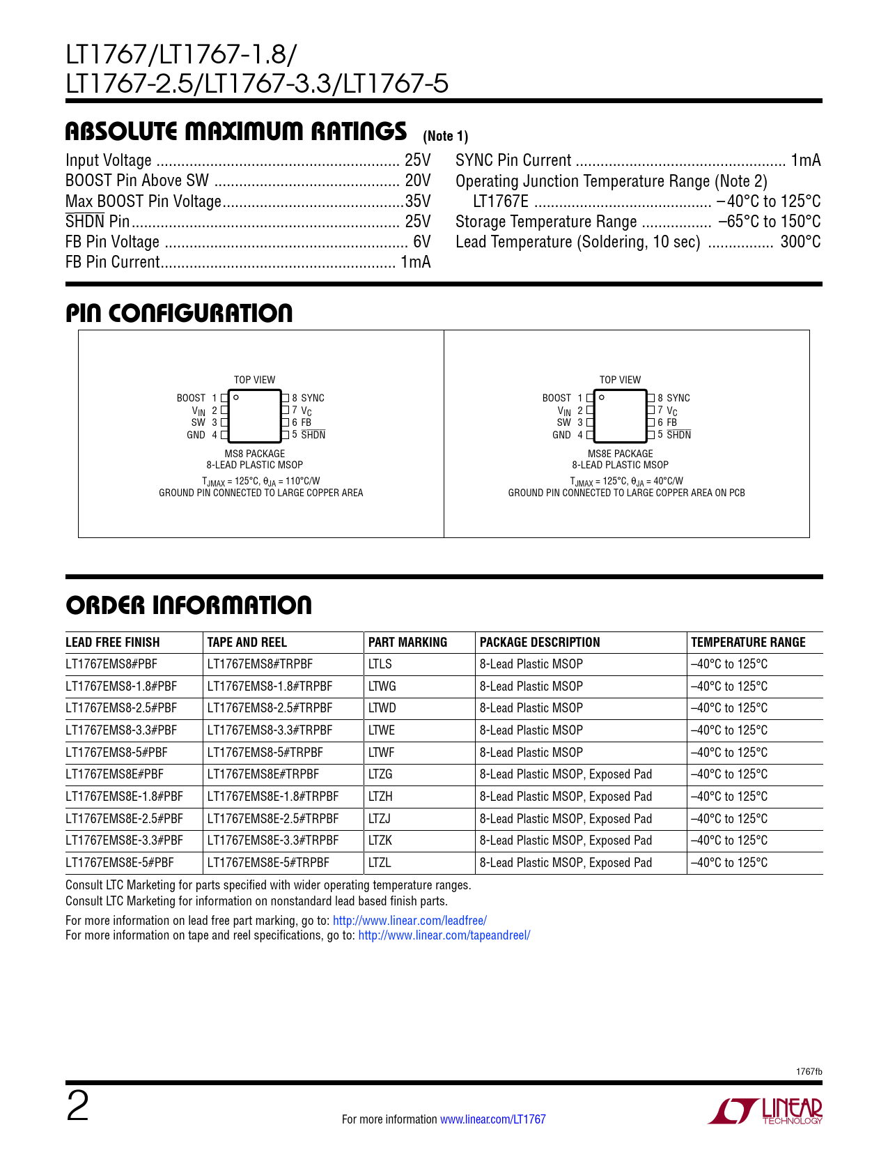 absoluTe MaxiMuM raTings (Note 1) pin conFiguraTion orDer inForMaTion LEAD FREE FINISH TAPE AND REEL PART MARKING