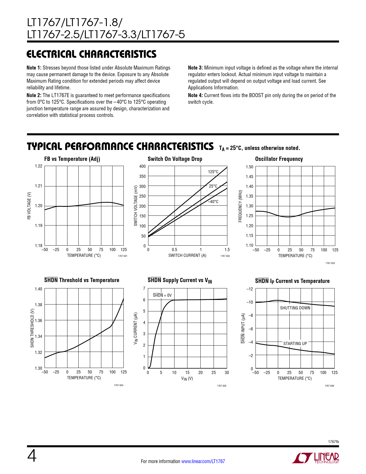 LT1767/LT1767-1.8/ LT1767-2.5/LT1767-3.3/LT1767-5 elecTrical characTerisTicsNote 1: Stresses beyond those listed under Absolute Maximum Ratings Note 3: Minimum input voltage is defined as the voltage where the internal may cause permanent damage to the device. Exposure to any Absolute regulator enters lockout. Actual minimum input voltage to maintain a Maximum Rating condition for extended periods may affect device regulated output will depend on output voltage and load current. See reliability and lifetime. Applications Information. Note 2: The LT1767E is guaranteed to meet performance specifications Note 4: Current flows into the BOOST pin only during the on period of the from 0°C to 125°C. Specifications over the –40°C to 125°C operating switch cycle. junction temperature range are assured by design, characterization and correlation with statistical process controls. Typical perForMance characTerisTics TA = 25°C, unless otherwise noted.FB vs Temperature (Adj)Switch On Voltage DropOscillator Frequency 1.22 400 1.50 125°C 350 1.45 1.21 300 25°C 1.40 250 1.35 –40°C 1.20 200 1.30 FB VOLTAGE (V) 150 1.25 FREQUENCY (MHz) 1.19 SWITCH VOLTAGE (mV) 100 1.20 50 1.15 1.18 0 1.10 –50 –25 0 25 50 75 100 125 0 0.5 1 1.5 –50 –25 0 25 50 75 100 125 TEMPERATURE (°C) 1767 G01 SWITCH CURRENT (A) 1767 G02 TEMPERATURE (°C) 1767 G03 SHDN Threshold vs TemperatureSHDN Supply Current vs VINSHDN IP Current vs Temperature 1.40 7 –12 SHDN = 0V 6 1.38 –10 SHUTTING DOWN 5 –8 1.36 4 –6 3 INPUT (µA) 1.34 CURRENT (µA) V IN SHDN –4 SHDN THRESHOLD (V) 2 STARTING UP 1.32 1 –2 1.30 0 0 –50 –25 0 25 50 75 100 125 0 5 10 15 20 25 30 –50 –25 0 25 50 75 100 125 TEMPERATURE (°C) VIN (V) TEMPERATURE (°C) 1767 G04 1767 G05 1767 G06 1767fb 4 For more information www.linear.com/LT1767 Document Outline Description Typical Application Absolute Maximum Ratings Electrical Characteristics Typical Application