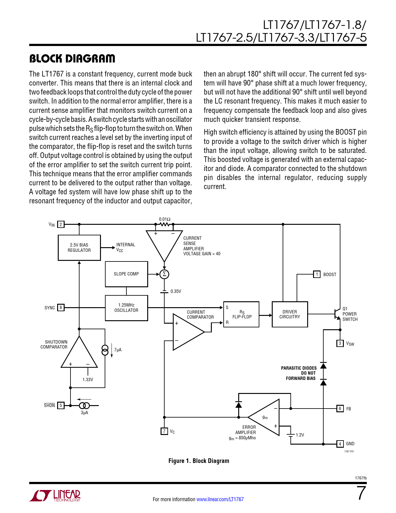 1.33V SHDN 5 – 6 FB 3µA gm + ERROR 7 VC AMPLIFIER g 1.2V m = 850µMho 4 GND 1767 F01