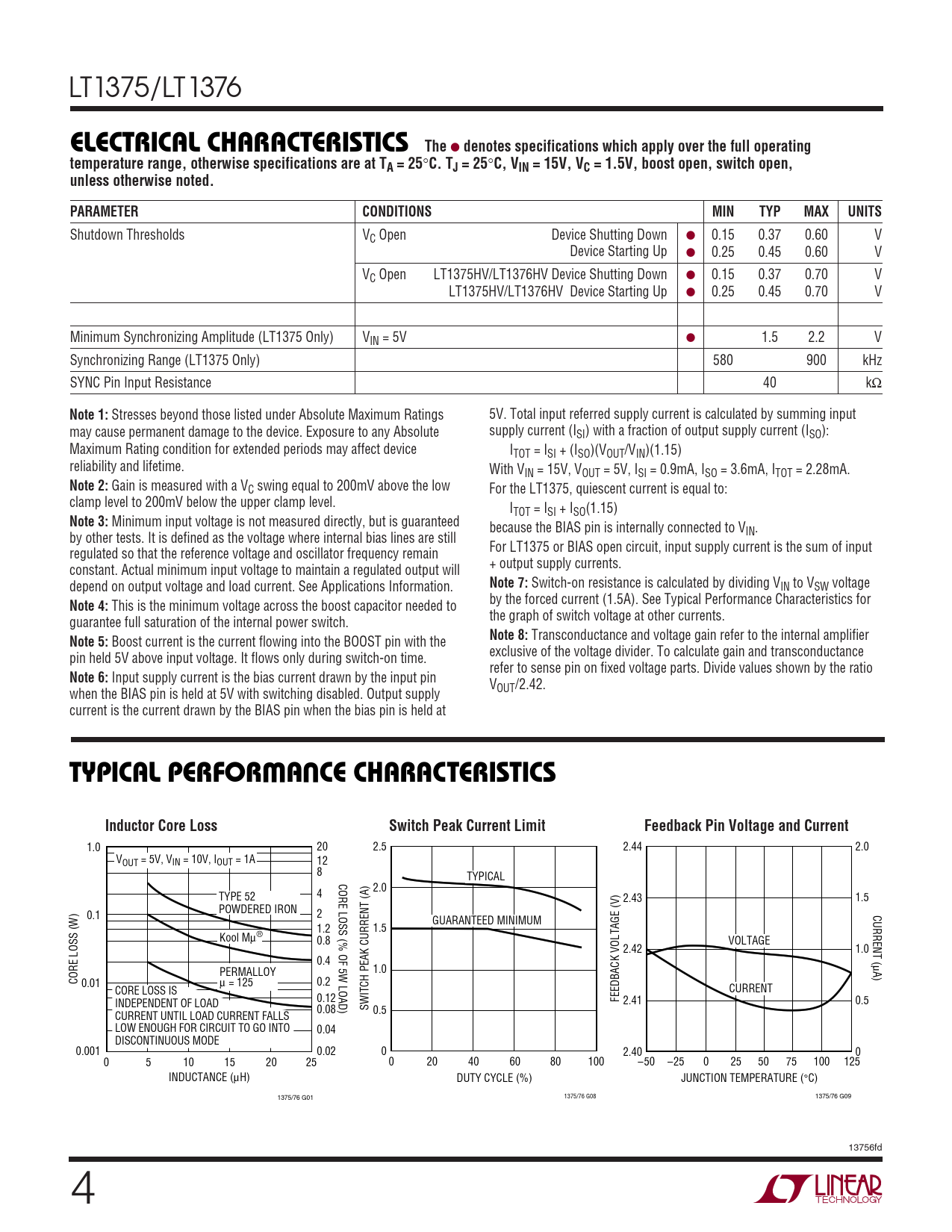 LT1375/LT1376 ELECTRICAL CHARACTERISTICS The ● denotes specifications which apply over the full operatingtemperature range, otherwise specifications are at TA = 25 ° C. TJ = 25 ° C, VIN = 15V, VC = 1.5V, boost open, switch open,unless otherwise noted.PARAMETERCONDITIONSMINTYPMAXUNITS Shutdown Thresholds VC Open Device Shutting Down ● 0.15 0.37 0.60 V Device Starting Up ● 0.25 0.45 0.60 V VC Open LT1375HV/LT1376HV Device Shutting Down ● 0.15 0.37 0.70 V LT1375HV/LT1376HV Device Starting Up ● 0.25 0.45 0.70 V Minimum Synchronizing Amplitude (LT1375 Only) VIN = 5V ● 1.5 2.2 V Synchronizing Range (LT1375 Only) 580 900 kHz SYNC Pin Input Resistance 40 kΩ Note 1: Stresses beyond those listed under Absolute Maximum Ratings 5V. Total input referred supply current is calculated by summing input may cause permanent damage to the device. Exposure to any Absolute supply current (ISI) with a fraction of output supply current (ISO): Maximum Rating condition for extended periods may affect device ITOT = ISI + (ISO)(VOUT/VIN)(1.15) reliability and lifetime. With VIN = 15V, VOUT = 5V, ISI = 0.9mA, ISO = 3.6mA, ITOT = 2.28mA. Note 2: Gain is measured with a VC swing equal to 200mV above the low For the LT1375, quiescent current is equal to: clamp level to 200mV below the upper clamp level. ITOT = ISI + ISO(1.15) Note 3: Minimum input voltage is not measured directly, but is guaranteed because the BIAS pin is internally connected to V by other tests. It is defined as the voltage where internal bias lines are still IN. For LT1375 or BIAS open circuit, input supply current is the sum of input regulated so that the reference voltage and oscillator frequency remain + output supply currents. constant. Actual minimum input voltage to maintain a regulated output will depend on output voltage and load current. See Applications Information. Note 7: Switch-on resistance is calculated by dividing VIN to VSW voltage by the forced current (1.5A). See Typical Performance Characteristics for Note 4: This is the minimum voltage across the boost capacitor needed to the graph of switch voltage at other currents. guarantee full saturation of the internal power switch. Note 8: Transconductance and voltage gain refer to the internal amplifier Note 5: Boost current is the current flowing into the BOOST pin with the exclusive of the voltage divider. To calculate gain and transconductance pin held 5V above input voltage. It flows only during switch-on time. refer to sense pin on fixed voltage parts. Divide values shown by the ratio Note 6: Input supply current is the bias current drawn by the input pin V when the BIAS pin is held at 5V with switching disabled. Output supply OUT/2.42. current is the current drawn by the BIAS pin when the bias pin is held at WUTYPICAL PERFORMANCE CHARACTERISTICSInductor Core LossSwitch Peak Current LimitFeedback Pin Voltage and Current 1.0 20 2.5 2.44 2.0 VOUT = 5V, VIN = 10V, IOUT = 1A 12 8 CORE LOSS (% OF 5W LOAD) TYPICAL 2.0 4 TYPE 52 2.43 1.5 POWDERED IRON 0.1 2 CURRENT ( GUARANTEED MINIMUM 1.2 1.5 Kool Mµ® 0.8 VOLTAGE 2.42 1.0 0.4 µ PERMALLOY 1.0 A) CORE LOSS (W) 0.01 µ = 125 0.2 CORE LOSS IS CURRENT 0.12 FEEDBACK VOLTAGE (V) INDEPENDENT OF LOAD 2.41 0.5 0.08 SWITCH PEAK CURRENT (A) 0.5 CURRENT UNTIL LOAD CURRENT FALLS LOW ENOUGH FOR CIRCUIT TO GO INTO 0.04 DISCONTINUOUS MODE 0.001 0.02 0 2.40 0 0 5 10 15 20 25 0 20 40 60 80 100 –50 –25 0 25 50 75 100 125 INDUCTANCE (µH) DUTY CYCLE (%) JUNCTION TEMPERATURE (°C) 1375/76 G01 1375/76 G08 1375/76 G09 13756fd 4
