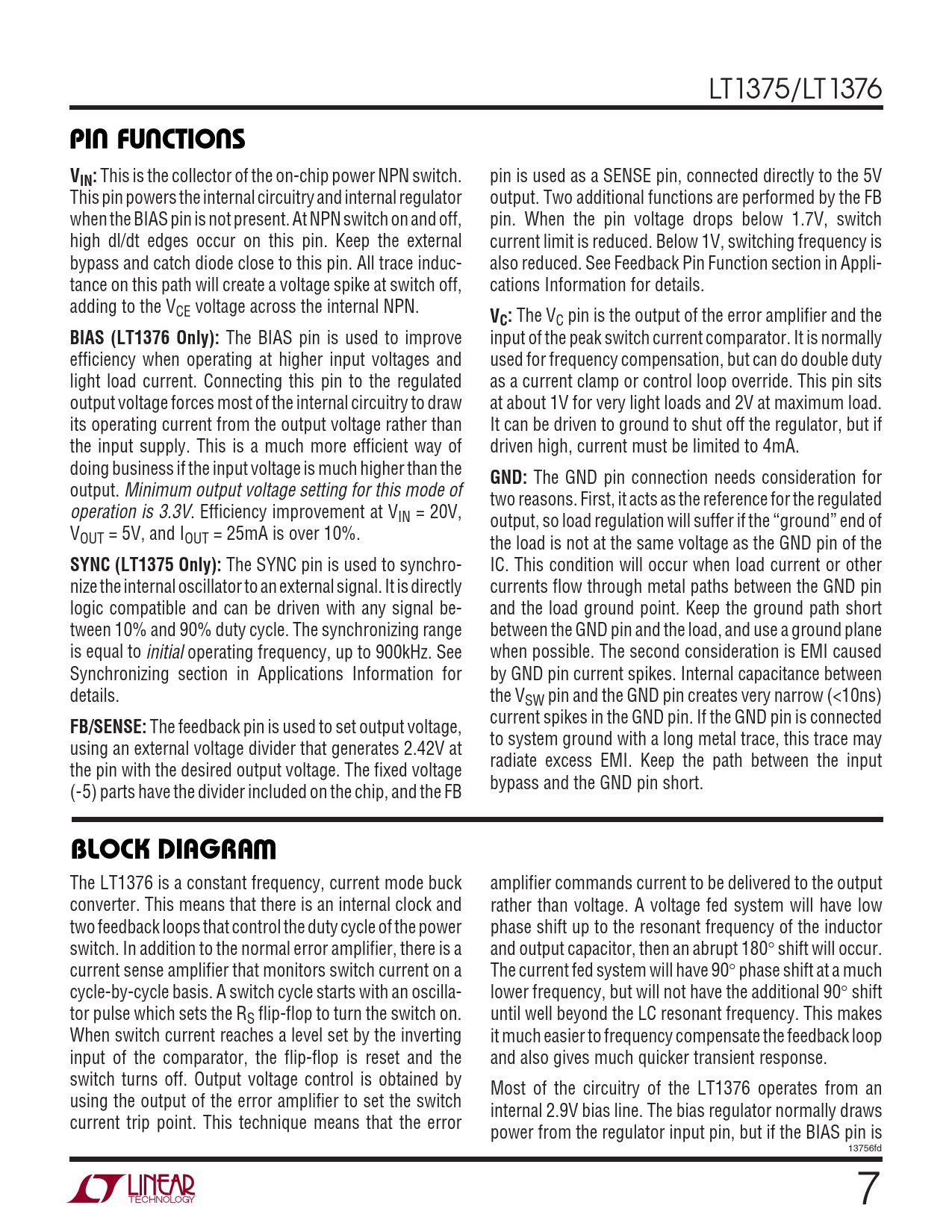 PIN FUNCTIONS. VIN:. VC:. BIAS (LT1376 Only):. GND:. SYNC (LT1375 Only):. FB/SENSE:. BLOCK DIAGRAM