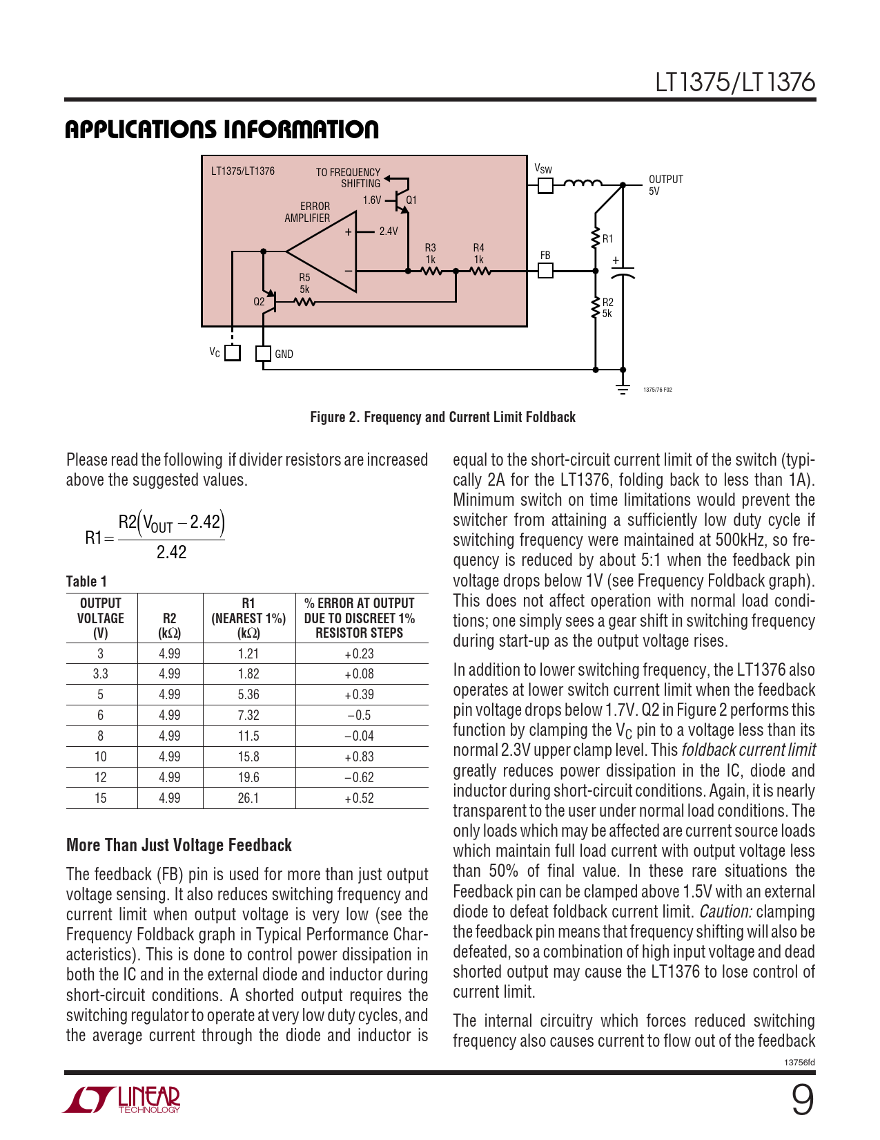 LT1375/LT1376 UUWUAPPLICATIONS INFORMATION VSW LT1375/LT1376 TO FREQUENCY SHIFTING OUTPUT 5V 1.6V Q1 ERROR AMPLIFIER + 2.4V R1 R3 R4 1k 1k FB + – R5 5k Q2 R2 5k VC GND 1375/76 F02 Figure 2. Frequency and Current Limit Foldback Please read the following if divider resistors are increased equal to the short-circuit current limit of the switch (typi- above the suggested values. cally 2A for the LT1376, folding back to less than 1A). Minimum switch on time limitations would prevent the R2 V ( − . ) switcher from attaining a sufficiently low duty cycle if OUT 2 42 R1= switching frequency were maintained at 500kHz, so fre- 2 4 . 2 quency is reduced by about 5:1 when the feedback pin Table 1 voltage drops below 1V (see Frequency Foldback graph). OUTPUTR1% ERROR AT OUTPUT This does not affect operation with normal load condi- VOLTAGER2(NEAREST 1%)DUE TO DISCREET 1% tions; one simply sees a gear shift in switching frequency (V)(k Ω )(k Ω )RESISTOR STEPS during start-up as the output voltage rises. 3 4.99 1.21 + 0.23 3.3 4.99 1.82 + 0.08 In addition to lower switching frequency, the LT1376 also 5 4.99 5.36 + 0.39 operates at lower switch current limit when the feedback 6 4.99 7.32 – 0.5 pin voltage drops below 1.7V. Q2 in Figure 2 performs this 8 4.99 11.5 – 0.04 function by clamping the VC pin to a voltage less than its normal 2.3V upper clamp level. This foldback current limit 10 4.99 15.8 + 0.83 greatly reduces power dissipation in the IC, diode and 12 4.99 19.6 – 0.62 inductor during short-circuit conditions. Again, it is nearly 15 4.99 26.1 + 0.52 transparent to the user under normal load conditions. The only loads which may be affected are current source loads More Than Just Voltage Feedback which maintain full load current with output voltage less The feedback (FB) pin is used for more than just output than 50% of final value. In these rare situations the voltage sensing. It also reduces switching frequency and Feedback pin can be clamped above 1.5V with an external current limit when output voltage is very low (see the diode to defeat foldback current limit. Caution: clamping Frequency Foldback graph in Typical Performance Char- the feedback pin means that frequency shifting will also be acteristics). This is done to control power dissipation in defeated, so a combination of high input voltage and dead both the IC and in the external diode and inductor during shorted output may cause the LT1376 to lose control of short-circuit conditions. A shorted output requires the current limit. switching regulator to operate at very low duty cycles, and The internal circuitry which forces reduced switching the average current through the diode and inductor is frequency also causes current to flow out of the feedback 13756fd 9