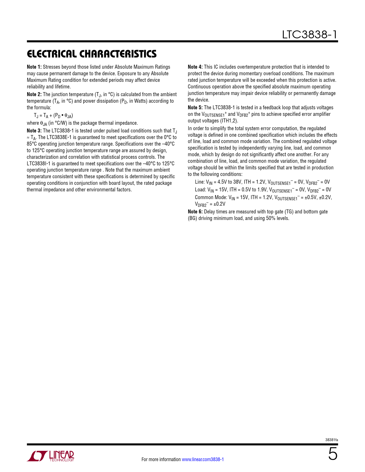The LTC3838-1 is tested under pulsed load conditions such that T In order to simplify the total system error computation, the regulated J ≈ T voltage is defined in one combined specification which includes the effects A. The LTC3838E-1 is guaranteed to meet specifications over the 0°C to 85°C operating junction temperature range. Specifications over the –40°C of line, load and common mode variation. The combined regulated voltage to 125°C operating junction temperature range are assured by design, specification is tested by independently varying line, load, and common characterization and correlation with statistical process controls. The mode, which by design do not significantly affect one another. For any LTC3838I-1 is guaranteed to meet specifications over the –40°C to 125°C combination of line, load, and common mode variation, the regulated operating junction temperature range . Note that the maximum ambient voltage should be within the limits specified that are tested in production temperature consistent with these specifications is determined by specific to the following conditions: operating conditions in conjunction with board layout, the rated package Line: V – – IN = 4.5V to 38V, ITH = 1.2V, VOUTSENSE1 = 0V, VDFB2 = 0V thermal impedance and other environmental factors. Load: V – – IN = 15V, ITH = 0.5V to 1.9V, VOUTSENSE1 = 0V, VDFB2 = 0V Common Mode: V – IN = 15V, ITH = 1.2V, VOUTSENSE1 = ±0.5V, ±0.2V, V – DFB2 = ±0.2V