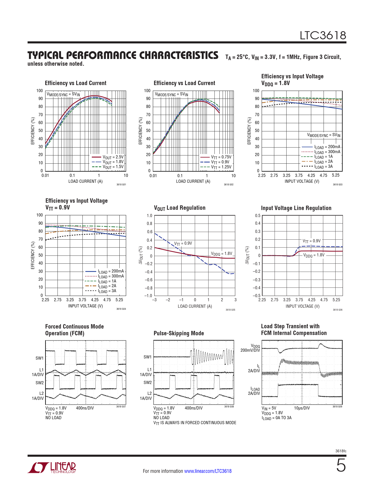 100 100 100 VMODE/SYNC = SVIN VMODE/SYNC = SVIN 90 90 90 80 80 80 70 70 70 60 60 60 50 50 50 VMODE/SYNC = SVIN 40 40 40 EFFICIENCY (%) EFFICIENCY (%) EFFICIENCY (%) 30 30 30 ILOAD = 200mA I 20 20 LOAD = 300mA VOUT = 2.5V V 20 TT = 0.75V ILOAD = 1A 10 VOUT = 1.8V 10 VTT = 0.9V 10 ILOAD = 2A VOUT = 1.5V VTT = 1.25V ILOAD = 3A 0 0 0 0.01 0.1 1 10 0.01 0.1 1 10 2.25 2.75 3.25 3.75 4.25 4.75 5.25 LOAD CURRENT (A) LOAD CURRENT (A) INPUT VOLTAGE (V) 3618 G01 3618 G02 3618 G03