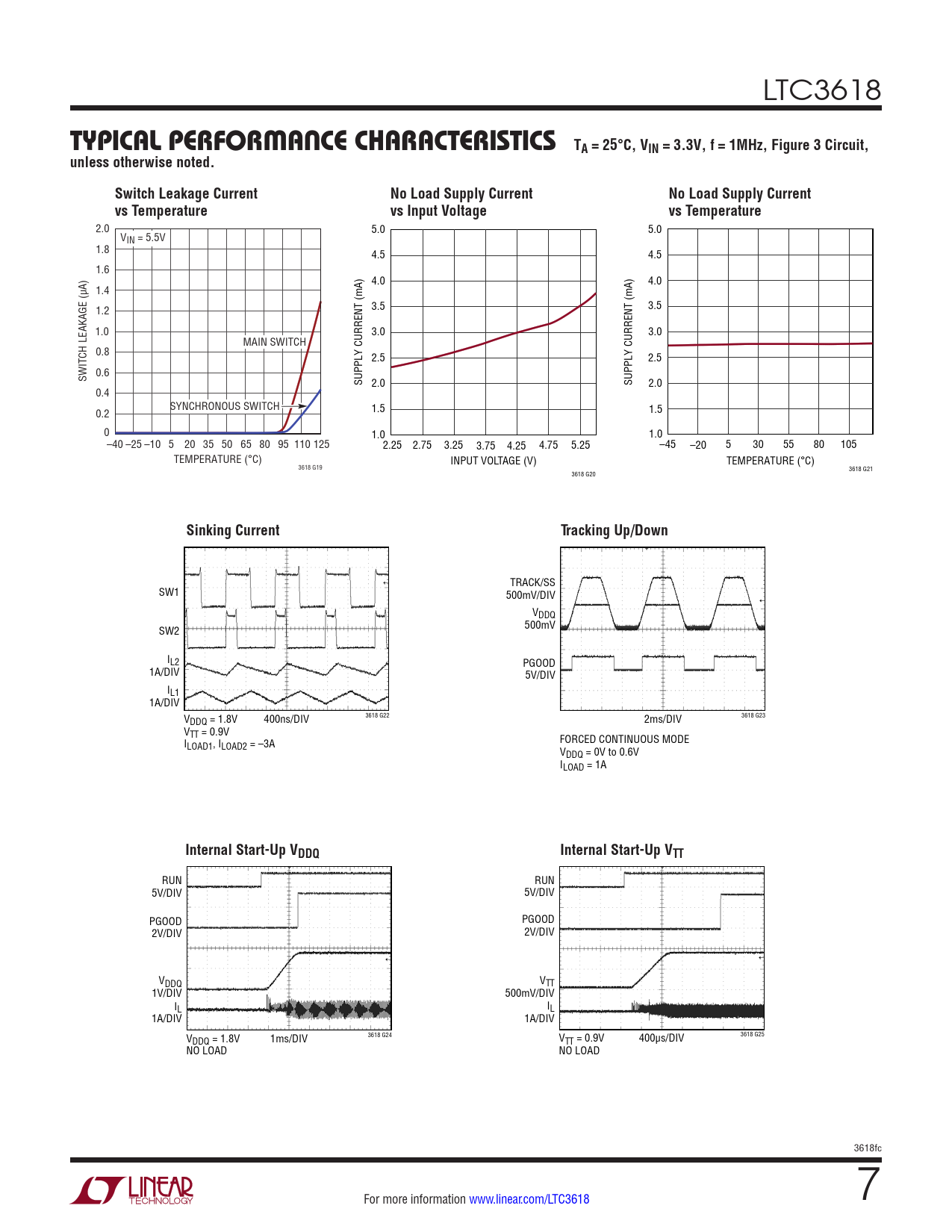 TRACK/SS SW1 500mV/DIV VDDQ SW2 500mV IL2 PGOOD 1A/DIV 5V/DIV IL1 1A/DIV 3618 G22 V 3618 G23 DDQ = 1.8V 400ns/DIV 2ms/DIV VTT = 0.9V I FORCED CONTINUOUS MODE LOAD1, ILOAD2 = –3A VDDQ = 0V to 0.6V ILOAD = 1A