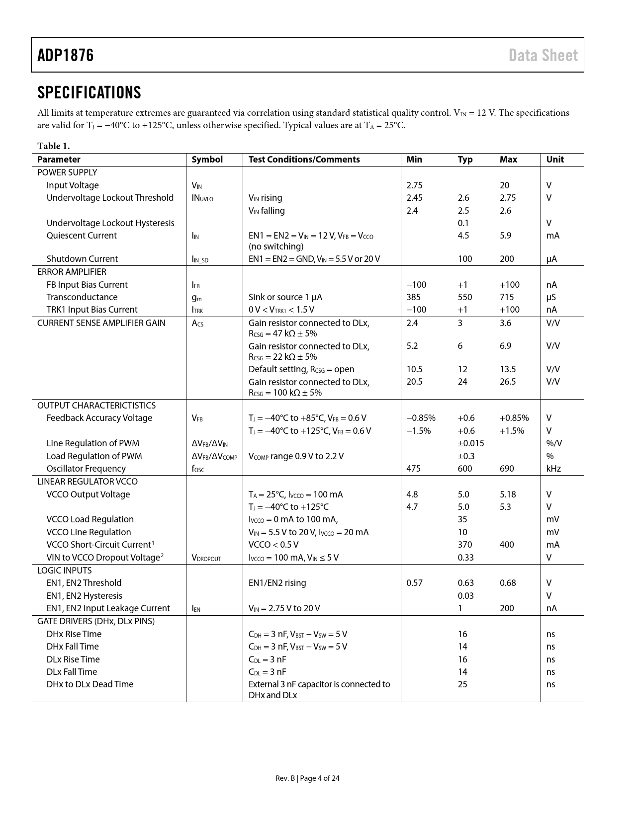 link to page 6 ADP1876Data SheetSPECIFICATIONS All limits at temperature extremes are guaranteed via correlation using standard statistical quality control. VIN = 12 V. The specifications are valid for TJ = −40°C to +125°C, unless otherwise specified. Typical values are at TA = 25°C. Table 1. ParameterSymbolTest Conditions/CommentsMinTypMaxUnit POWER SUPPLY Input Voltage VIN 2.75 20 V Undervoltage Lockout Threshold INUVLO VIN rising 2.45 2.6 2.75 V VIN falling 2.4 2.5 2.6 Undervoltage Lockout Hysteresis 0.1 V Quiescent Current IIN EN1 = EN2 = VIN = 12 V, VFB = VCCO 4.5 5.9 mA (no switching) Shutdown Current IIN_SD EN1 = EN2 = GND, VIN = 5.5 V or 20 V 100 200 µA ERROR AMPLIFIER FB Input Bias Current IFB −100 +1 +100 nA Transconductance gm Sink or source 1 µA 385 550 715 µS TRK1 Input Bias Current ITRK 0 V < VTRK1 < 1.5 V −100 +1 +100 nA CURRENT SENSE AMPLIFIER GAIN ACS Gain resistor connected to DLx, 2.4 3 3.6 V/V RCSG = 47 kΩ ± 5% Gain resistor connected to DLx, 5.2 6 6.9 V/V RCSG = 22 kΩ ± 5% Default setting, RCSG = open 10.5 12 13.5 V/V Gain resistor connected to DLx, 20.5 24 26.5 V/V RCSG = 100 kΩ ± 5% OUTPUT CHARACTERICTISTICS Feedback Accuracy Voltage VFB TJ = −40°C to +85°C, VFB = 0.6 V −0.85% +0.6 +0.85% V TJ = −40°C to +125°C, VFB = 0.6 V −1.5% +0.6 +1.5% V Line Regulation of PWM ΔVFB/ΔVIN ±0.015 %/V Load Regulation of PWM ΔVFB/ΔVCOMP VCOMP range 0.9 V to 2.2 V ±0.3 % Oscillator Frequency fOSC 475 600 690 kHz LINEAR REGULATOR VCCO VCCO Output Voltage TA = 25°C, IVCCO = 100 mA 4.8 5.0 5.18 V TJ = −40°C to +125°C 4.7 5.0 5.3 V VCCO Load Regulation IVCCO = 0 mA to 100 mA, 35 mV VCCO Line Regulation VIN = 5.5 V to 20 V, IVCCO = 20 mA 10 mV VCCO Short-Circuit Current1 VCCO < 0.5 V 370 400 mA VIN to VCCO Dropout Voltage2 VDROPOUT IVCCO = 100 mA, VIN ≤ 5 V 0.33 V LOGIC INPUTS EN1, EN2 Threshold EN1/EN2 rising 0.57 0.63 0.68 V EN1, EN2 Hysteresis 0.03 V EN1, EN2 Input Leakage Current IEN VIN = 2.75 V to 20 V 1 200 nA GATE DRIVERS (DHx, DLx PINS) DHx Rise Time CDH = 3 nF, VBST − VSW = 5 V 16 ns DHx Fall Time CDH = 3 nF, VBST − VSW = 5 V 14 ns DLx Rise Time CDL = 3 nF 16 ns DLx Fall Time CDL = 3 nF 14 ns DHx to DLx Dead Time External 3 nF capacitor is connected to 25 ns DHx and DLx Rev. B | Page 4 of 24 Document Outline FEATURES APPLICATIONS TYPICAL OPERATION CIRCUIT GENERAL DESCRIPTION TABLE OF CONTENTS REVISION HISTORY FUNCTIONAL BLOCK DIAGRAM SPECIFICATIONS ABSOLUTE MAXIMUM RATINGS ESD CAUTION PIN CONFIGURATION AND FUNCTION DESCRIPTIONS TYPICAL PERFORMANCE CHARACTERISTICS THEORY OF OPERATION INDEPENDENT LOW DROPOUT LINEAR REGULATOR CONTROLLER ARCHITECTURE Synchronous Rectifier and Dead Time INPUT UNDERVOLTAGE LOCKOUT INTERNAL LINEAR REGULATOR (VCCO) OVERVOLTAGE PROTECTION POWER GOOD SHORT-CIRCUIT AND CURRENT-LIMIT PROTECTION SHUTDOWN CONTROL THERMAL OVERLOAD PROTECTION APPLICATIONS INFORMATION INDEPENDENT LOW DROPOUT LINEAR REGULATOR SETTING THE OUTPUT VOLTAGE OF THE CONTROLLER SOFT START SETTING THE CURRENT LIMIT ACCURATE CURRENT-LIMIT SENSING SETTING THE SLOPE COMPENSATION SETTING THE CURRENT SENSE GAIN INPUT CAPACITOR SELECTION INPUT FILTER BOOST CAPACITOR SELECTION INDUCTOR SELECTION OUTPUT CAPACITOR SELECTION MOSFET SELECTION LOOP COMPENSATION SWITCHING NOISE AND OVERSHOOT REDUCTION PCB LAYOUT GUIDELINE TYPICAL APPLICATIONS CIRCUIT PACKAGING AND ORDERING INFORMATION OUTLINE DIMENSIONS ORDERING GUIDE