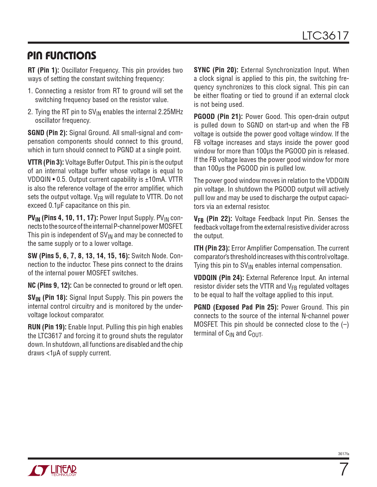 pin Functions. RT (Pin 1):. SYNC (Pin 20):. PGOOD (Pin 21):. SGND (Pin 2):. VTTR (Pin 3):. PVIN (Pins 4, 10, 11, 17):. VFB (Pin 22):