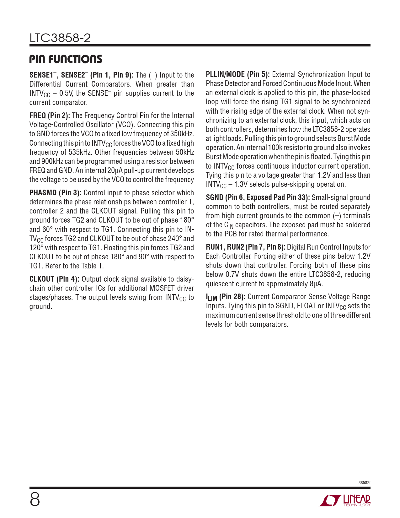 Current Comparator Sense Voltage Range ground. Inputs. Tying this pin to SGND, FLOAT or INTVCC sets the maximum current sense threshold to one of three different levels for both comparators. 38582f 8