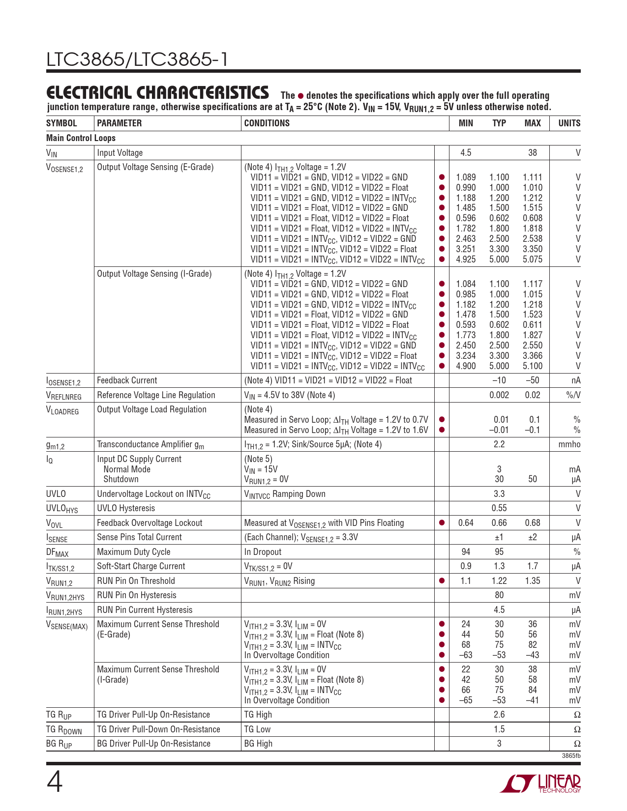 VIN Input Voltage 4.5 38 V VOSENSE1,2 Output Voltage Sensing (E-Grade) (Note 4) ITH1,2 Voltage = 1.2V VID11 = VID21 = GND, VID12 = VID22 = GND l 1.089 1.100 1.111 V VID11 = VID21 = GND, VID12 = VID22 = Float l 0.990 1.000 1.010 V VID11 = VID21 = GND, VID12 = VID22 = INTVCC l 1.188 1.200 1.212 V VID11 = VID21 = Float, VID12 = VID22 = GND l 1.485 1.500 1.515 V VID11 = VID21 = Float, VID12 = VID22 = Float l 0.596 0.602 0.608 V VID11 = VID21 = Float, VID12 = VID22 = INTVCC l 1.782 1.800 1.818 V VID11 = VID21 = INTVCC, VID12 = VID22 = GND l 2.463 2.500 2.538 V VID11 = VID21 = INTVCC, VID12 = VID22 = Float l 3.251 3.300 3.350 V VID11 = VID21 = INTVCC, VID12 = VID22 = INTVCC l 4.925 5.000 5.075 V Output Voltage Sensing (I-Grade) (Note 4) ITH1,2 Voltage = 1.2V VID11 = VID21 = GND, VID12 = VID22 = GND l 1.084 1.100 1.117 V VID11 = VID21 = GND, VID12 = VID22 = Float l 0.985 1.000 1.015 V VID11 = VID21 = GND, VID12 = VID22 = INTVCC l 1.182 1.200 1.218 V VID11 = VID21 = Float, VID12 = VID22 = GND l 1.478 1.500 1.523 V VID11 = VID21 = Float, VID12 = VID22 = Float l 0.593 0.602 0.611 V VID11 = VID21 = Float, VID12 = VID22 = INTVCC l 1.773 1.800 1.827 V VID11 = VID21 = INTVCC, VID12 = VID22 = GND l 2.450 2.500 2.550 V VID11 = VID21 = INTVCC, VID12 = VID22 = Float l 3.234 3.300 3.366 V VID11 = VID21 = INTVCC, VID12 = VID22 = INTVCC l 4.900 5.000 5.100 V IOSENSE1,2 Feedback Current (Note 4) VID11 = VID21 = VID12 = VID22 = Float –10 –50 nA VREFLNREG Reference Voltage Line Regulation VIN = 4.5V to 38V (Note 4) 0.002 0.02 %/V VLOADREG Output Voltage Load Regulation (Note 4) Measured in Servo Loop; ΔITH Voltage = 1.2V to 0.7V l 0.01 0.1 % Measured in Servo Loop; ΔITH Voltage = 1.2V to 1.6V l –0.01 –0.1 % gm1,2 Transconductance Amplifi er gm ITH1,2 = 1.2V; Sink/Source 5μA; (Note 4) 2.2 mmho IQ Input DC Supply Current (Note 5) Normal Mode VIN = 15V 3 mA Shutdown VRUN1,2 = 0V 30 50 μA UVLO Undervoltage Lockout on INTVCC VINTVCC Ramping Down 3.3 V UVLOHYS UVLO Hysteresis 0.55 V VOVL Feedback Overvoltage Lockout Measured at VOSENSE1,2 with VID Pins Floating l 0.64 0.66 0.68 V ISENSE Sense Pins Total Current (Each Channel); VSENSE1,2 = 3.3V ±1 ±2 μA DFMAX Maximum Duty Cycle In Dropout 94 95 % ITK/SS1,2 Soft-Start Charge Current VTK/SS1,2 = 0V 0.9 1.3 1.7 μA VRUN1,2 RUN Pin On Threshold VRUN1, VRUN2 Rising l 1.1 1.22 1.35 V VRUN1,2HYS RUN Pin On Hysteresis 80 mV IRUN1,2HYS RUN Pin Current Hysteresis 4.5 μA VSENSE(MAX) Maximum Current Sense Threshold VITH1,2 = 3.3V, ILIM = 0V l 24 30 36 mV (E-Grade) VITH1,2 = 3.3V, ILIM = Float (Note 8) l 44 50 56 mV VITH1,2 = 3.3V, ILIM = INTVCC l 68 75 82 mV In Overvoltage Condition l –63 –53 –43 mV Maximum Current Sense Threshold VITH1,2 = 3.3V, ILIM = 0V l 22 30 38 mV (I-Grade) VITH1,2 = 3.3V, ILIM = Float (Note 8) l 42 50 58 mV VITH1,2 = 3.3V, ILIM = INTVCC l 66 75 84 mV In Overvoltage Condition l –65 –53 –41 mV TG RUP TG Driver Pull-Up On-Resistance TG High 2.6 Ω TG RDOWN TG Driver Pull-Down On-Resistance TG Low 1.5 Ω BG RUP BG Driver Pull-Up On-Resistance BG High 3 Ω 3865fb 4