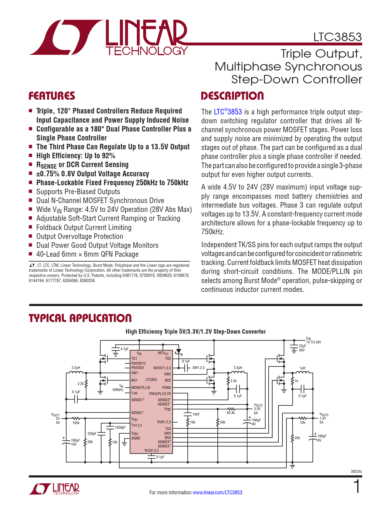 LTC3853 Triple Output, Multiphase Synchronous Step-Down Controller FEATURESDESCRIPTION n Triple, 120 ° Phased Controllers Reduce Required The LTC®3853 is a high performance triple output step- Input Capacitance and Power Supply Induced Noise down switching regulator controller that drives all N- n Configurable as a 180° Dual Phase Controller Plus a channel synchronous power MOSFET stages. Power loss Single Phase Controller and supply noise are minimized by operating the output n The Third Phase Can Regulate Up to a 13.5V Output stages out of phase. The part can be configured as a dual n High Efficiency: Up to 92% phase controller plus a single phase controller if needed. n RSENSE or DCR Current Sensing The part can also be configured to provide a single 3-phase n ±0.75% 0.8V Output Voltage Accuracy output for even higher output currents. n Phase-Lockable Fixed Frequency 250kHz to 750kHz A wide 4.5V to 24V (28V maximum) input voltage sup- n Supports Pre-Biased Outputs ply range encompasses most battery chemistries and n Dual N-Channel MOSFET Synchronous Drive intermediate bus voltages. Phase 3 can regulate output n Wide VIN Range: 4.5V to 24V Operation (28V Abs Max) voltages up to 13.5V. A constant-frequency current mode n Adjustable Soft-Start Current Ramping or Tracking architecture allows for a phase-lockable frequency up to n Foldback Output Current Limiting 750kHz. n Output Overvoltage Protection n Dual Power Good Output Voltage Monitors Independent TK/SS pins for each output ramps the output n 40-Lead 6mm × 6mm QFN Package voltages and can be configured for coincident or ratiometric L, LT, LTC, LTM, Linear Technology, Burst Mode, Polyphase and the Linear logo are registered tracking. Current foldback limits MOSFET heat dissipation trademarks of Linear Technology Corporation. All other trademarks are the property of their during short-circuit conditions. The MODE/PLLIN pin respective owners. Protected by U.S. Patents, including 5481178, 5705919, 5929620, 6100678, 6144194, 6177787, 6304066, 6580258. selects among Burst Mode® operation, pulse-skipping or continuous inductor current modes. TYPICAL APPLICATIONHigh Efficiency Triple 5V/3.3V/1.2V Step-Down Converter VIN 7V TO 24V 22µF 4.7µF 50V VIN INTVCC TG1 TG2 PGOOD12 0.1µF 2.2µH PGOOD3 BOOST1,2,3 SW1,2,3 2.2µH 1µH SW1 SW2 BG1 LTC3853 BG2 2.2k 1k 2.2k fIN MODE/PLLIN PGND 500kHz 0.1µF ILIM FREQ/PLLFLTR 0.1µF 0.1µF SENSE1+ SENSE2+ SENSE2– VOUT2 VFB2 3.3V SENSE1– 63.4k V 5A OUT1 10nF VOUT3 5V V + FB1 1.2V 100µF 5A RUN1,2,3 105k 10k 20k 10k 5A ITH1,2,3 6V 1500pF TG3 220pF VFB3 SW3 + + SGND BG3 20k 100µF 100µF 20k 15k SENSE3+ 6V 10V SENSE3– TK/SS1,2,3 0.1µF 3853fc For more information www.linear.com/LTC3853 1 Document Outline Features Typical Application Description Absolute Maximum Ratings Order Information Pin Configuration Electrical Characteristics Typical Performance Characteristics Pin Functions Functional Diagram Operation Applications Information Typical Applications Package Description Revision History Typical Application Related Parts