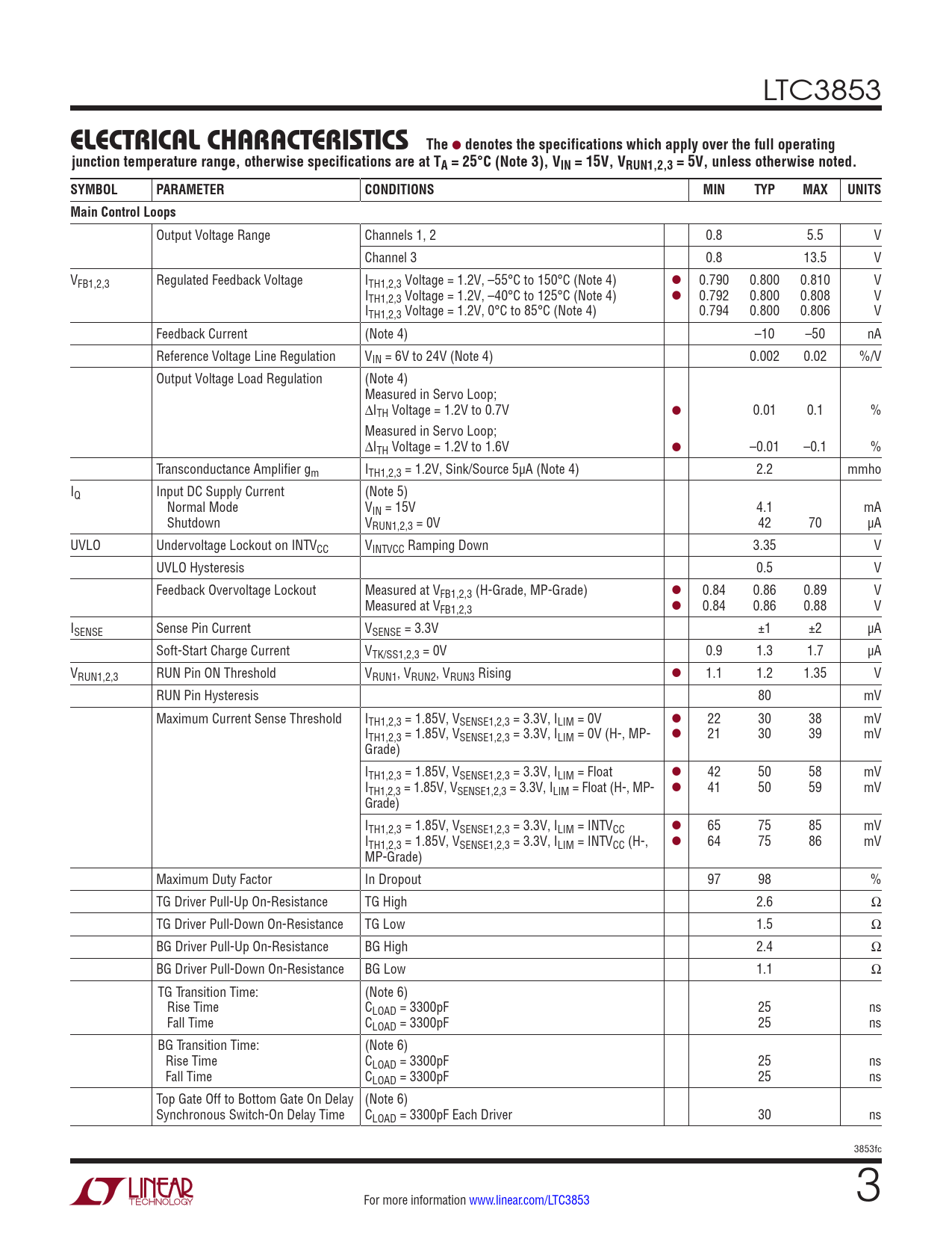 Output Voltage Range Channels 1, 2 0.8 5.5 V Channel 3 0.8 13.5 V VFB1,2,3 Regulated Feedback Voltage ITH1,2,3 Voltage = 1.2V, –55°C to 150°C (Note 4) l 0.790 0.800 0.810 V ITH1,2,3 Voltage = 1.2V, –40°C to 125°C (Note 4) l 0.792 0.800 0.808 V ITH1,2,3 Voltage = 1.2V, 0°C to 85°C (Note 4) 0.794 0.800 0.806 V Feedback Current (Note 4) –10 –50 nA Reference Voltage Line Regulation VIN = 6V to 24V (Note 4) 0.002 0.02 %/V Output Voltage Load Regulation (Note 4) Measured in Servo Loop; DITH Voltage = 1.2V to 0.7V l 0.01 0.1 % Measured in Servo Loop; DITH Voltage = 1.2V to 1.6V l –0.01 –0.1 % Transconductance Amplifier gm ITH1,2,3 = 1.2V, Sink/Source 5µA (Note 4) 2.2 mmho IQ Input DC Supply Current (Note 5) Normal Mode VIN = 15V 4.1 mA Shutdown VRUN1,2,3 = 0V 42 70 µA UVLO Undervoltage Lockout on INTVCC VINTVCC Ramping Down 3.35 V UVLO Hysteresis 0.5 V Feedback Overvoltage Lockout Measured at VFB1,2,3 (H-Grade, MP-Grade) l 0.84 0.86 0.89 V Measured at VFB1,2,3 l 0.84 0.86 0.88 V ISENSE Sense Pin Current VSENSE = 3.3V ±1 ±2 µA Soft-Start Charge Current VTK/SS1,2,3 = 0V 0.9 1.3 1.7 µA VRUN1,2,3 RUN Pin ON Threshold VRUN1, VRUN2, VRUN3 Rising l 1.1 1.2 1.35 V RUN Pin Hysteresis 80 mV Maximum Current Sense Threshold ITH1,2,3 = 1.85V, VSENSE1,2,3 = 3.3V, ILIM = 0V l 22 30 38 mV ITH1,2,3 = 1.85V, VSENSE1,2,3 = 3.3V, ILIM = 0V (H-, MP- l 21 30 39 mV Grade) ITH1,2,3 = 1.85V, VSENSE1,2,3 = 3.3V, ILIM = Float l 42 50 58 mV ITH1,2,3 = 1.85V, VSENSE1,2,3 = 3.3V, ILIM = Float (H-, MP- l 41 50 59 mV Grade) ITH1,2,3 = 1.85V, VSENSE1,2,3 = 3.3V, ILIM = INTVCC l 65 75 85 mV ITH1,2,3 = 1.85V, VSENSE1,2,3 = 3.3V, ILIM = INTVCC (H-, l 64 75 86 mV MP-Grade) Maximum Duty Factor In Dropout 97 98 % TG Driver Pull-Up On-Resistance TG High 2.6 Ω TG Driver Pull-Down On-Resistance TG Low 1.5 Ω BG Driver Pull-Up On-Resistance BG High 2.4 Ω BG Driver Pull-Down On-Resistance BG Low 1.1 Ω TG Transition Time: (Note 6) Rise Time CLOAD = 3300pF 25 ns Fall Time CLOAD = 3300pF 25 ns BG Transition Time: (Note 6) Rise Time CLOAD = 3300pF 25 ns Fall Time CLOAD = 3300pF 25 ns Top Gate Off to Bottom Gate On Delay (Note 6) Synchronous Switch-On Delay Time CLOAD = 3300pF Each Driver 30 ns 3853fc For more information www.linear.com/LTC3853 3 Document Outline Features Typical Application Description Absolute Maximum Ratings Order Information Pin Configuration Electrical Characteristics Typical Performance Characteristics Pin Functions Functional Diagram Operation Applications Information Typical Applications Package Description Revision History Typical Application Related Parts