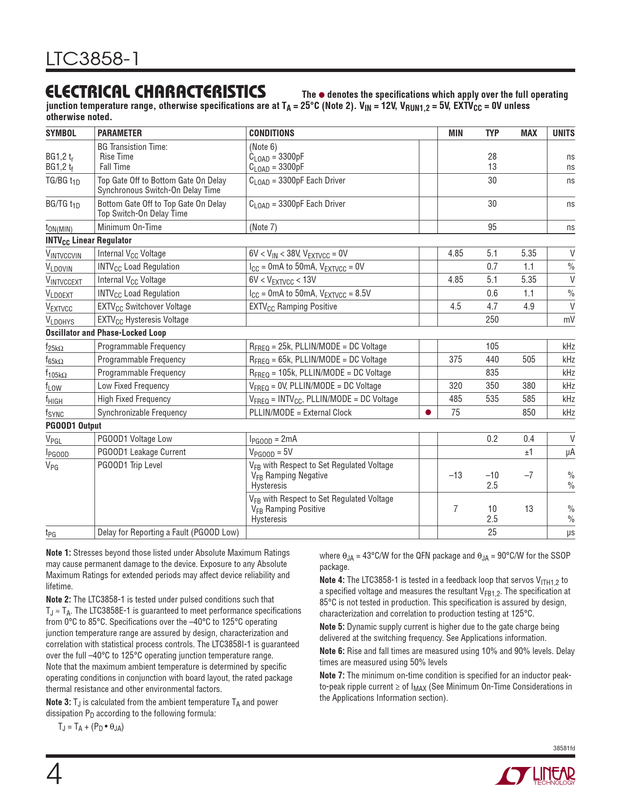 The LTC3858-1 is tested under pulsed conditions such that 85°C is not tested in production. This specifi cation is assured by design, TJ ≈ TA. The LTC3858E-1 is guaranteed to meet performance specifi cations characterization and correlation to production testing at 125°C. from 0°C to 85°C. Specifi cations over the –40°C to 125°C operating
